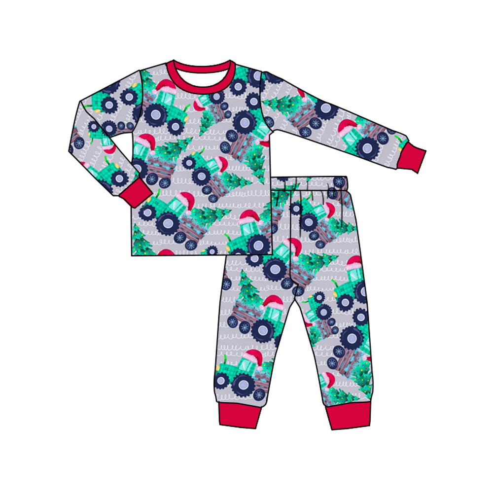 (Custom Design Preorder MOQ 20) Tractors Tree Print Kids Christmas Bamboo Pajamas Clothes Set