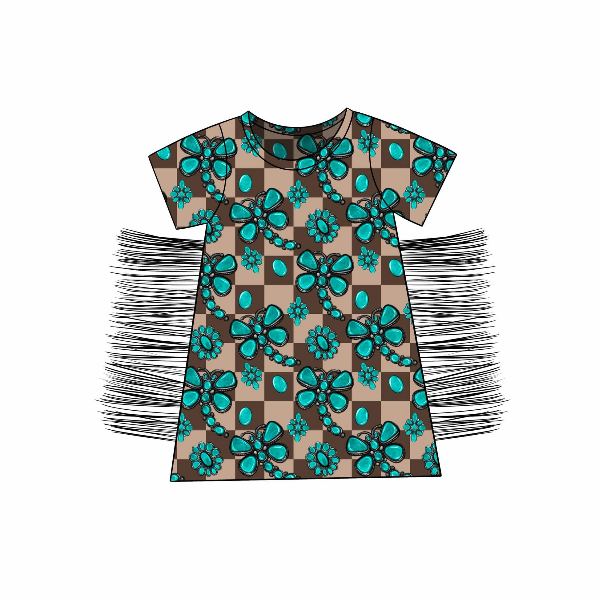 (Custom Design Preorder MOQ 5) Turquoise Plaid Print Tassels Girls Western Knee Length Dress