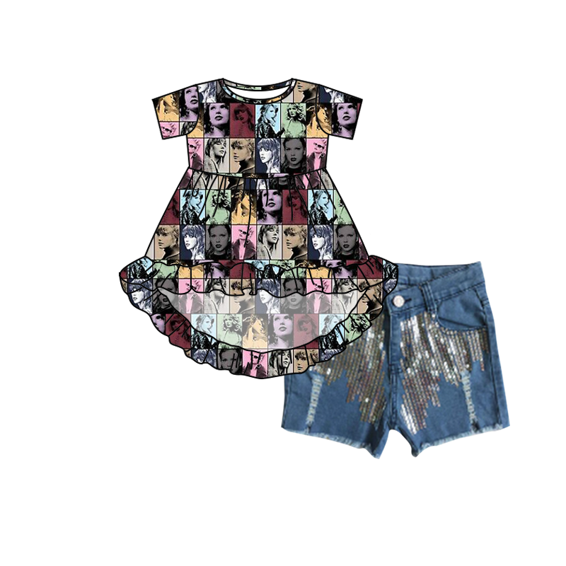 (Custom Design Preorder MOQ 5)D7-4 Swiftie High-Low Top Blue Sequins Denim Shorts Girls Summer Clothes Set