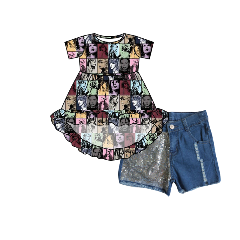 (Custom Design Preorder MOQ 5)D8-14 Swiftie High-Low Top Blue Sequins Denim Shorts Girls Summer Clothes Set