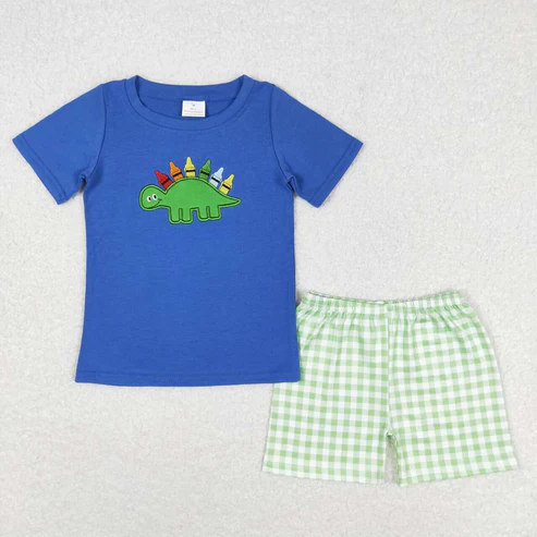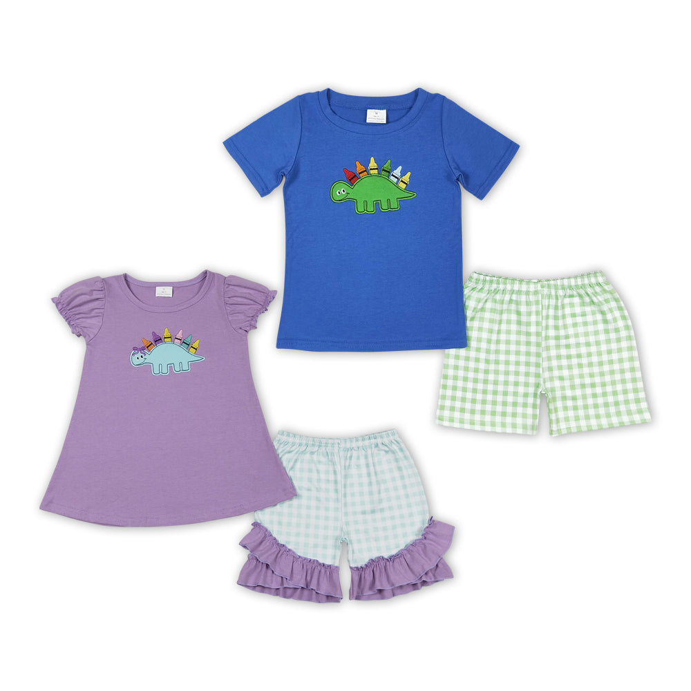 Dino Pen Embroidery Top Plaid Shorts Sibling Back to School Matching Clothes