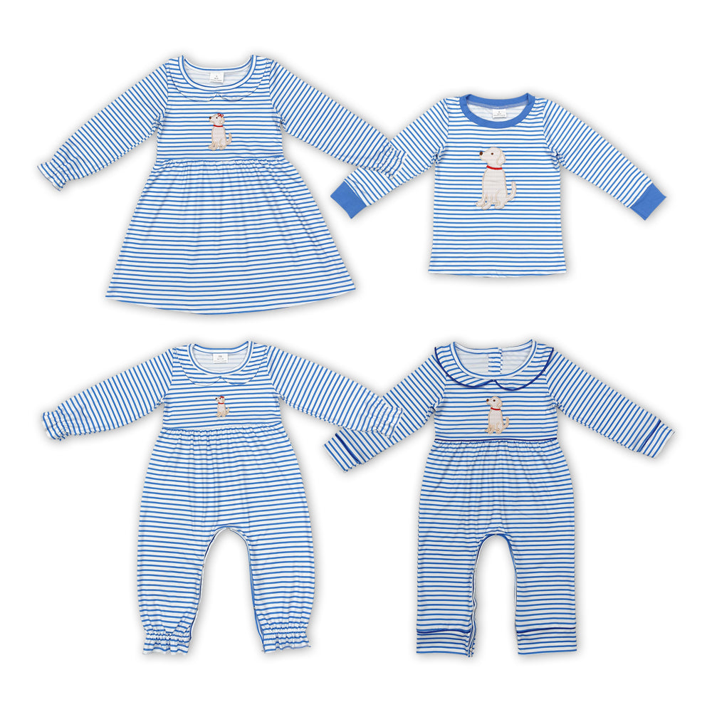 Dog Embroidery Blue Stripes Print Sibling Matching Clothes