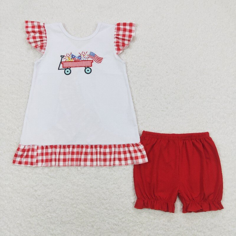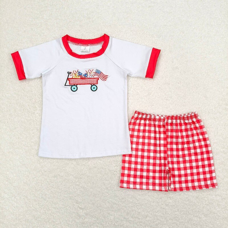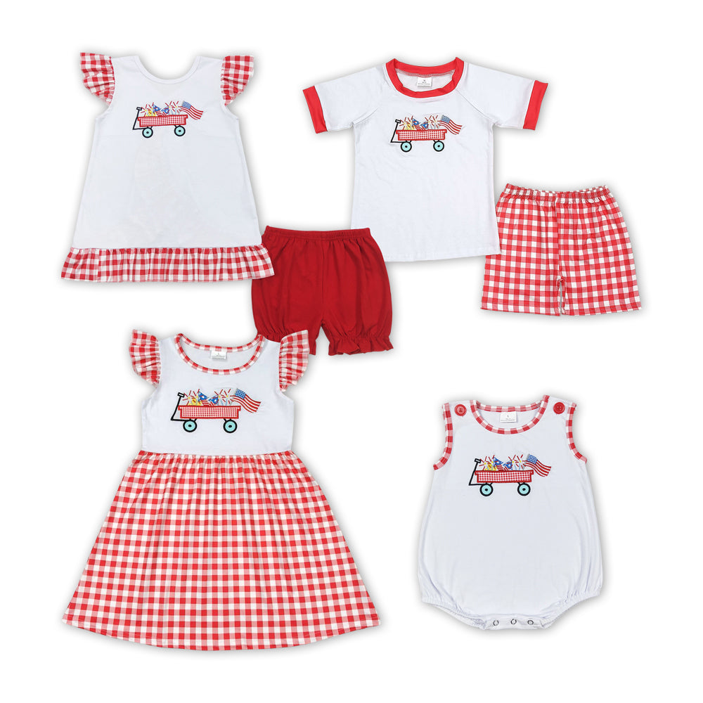 Fireworks Flag Truck Embroidery Red Plaid Print Sibling 4th of July Matching Clothes