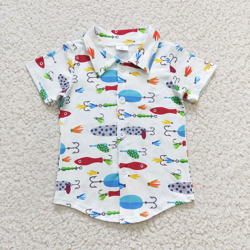 Fishing Print Boys Summer Short Sleeve Tee Shirts Top Brothers Wear