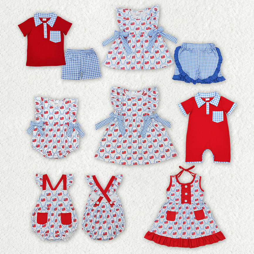 Flag Blue Bows Plaid Print Sibling 4th of July Matching Clothes