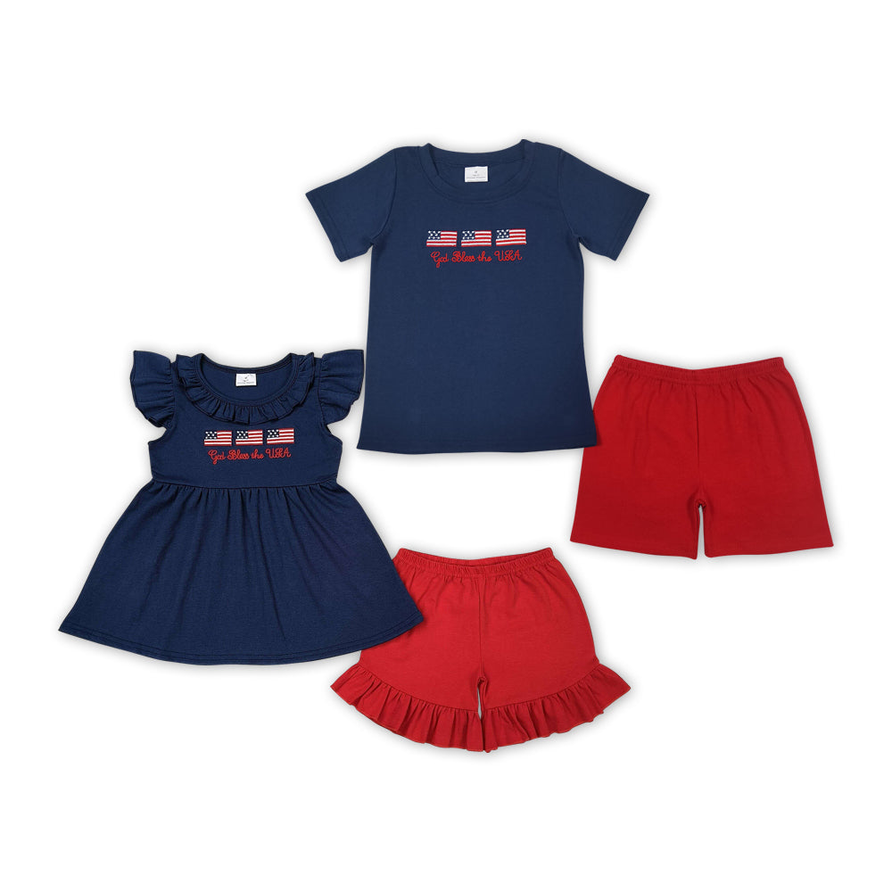 Flags Embroidery Navy Top Red Shorts Sibling 4th of July Matching Clothes Set
