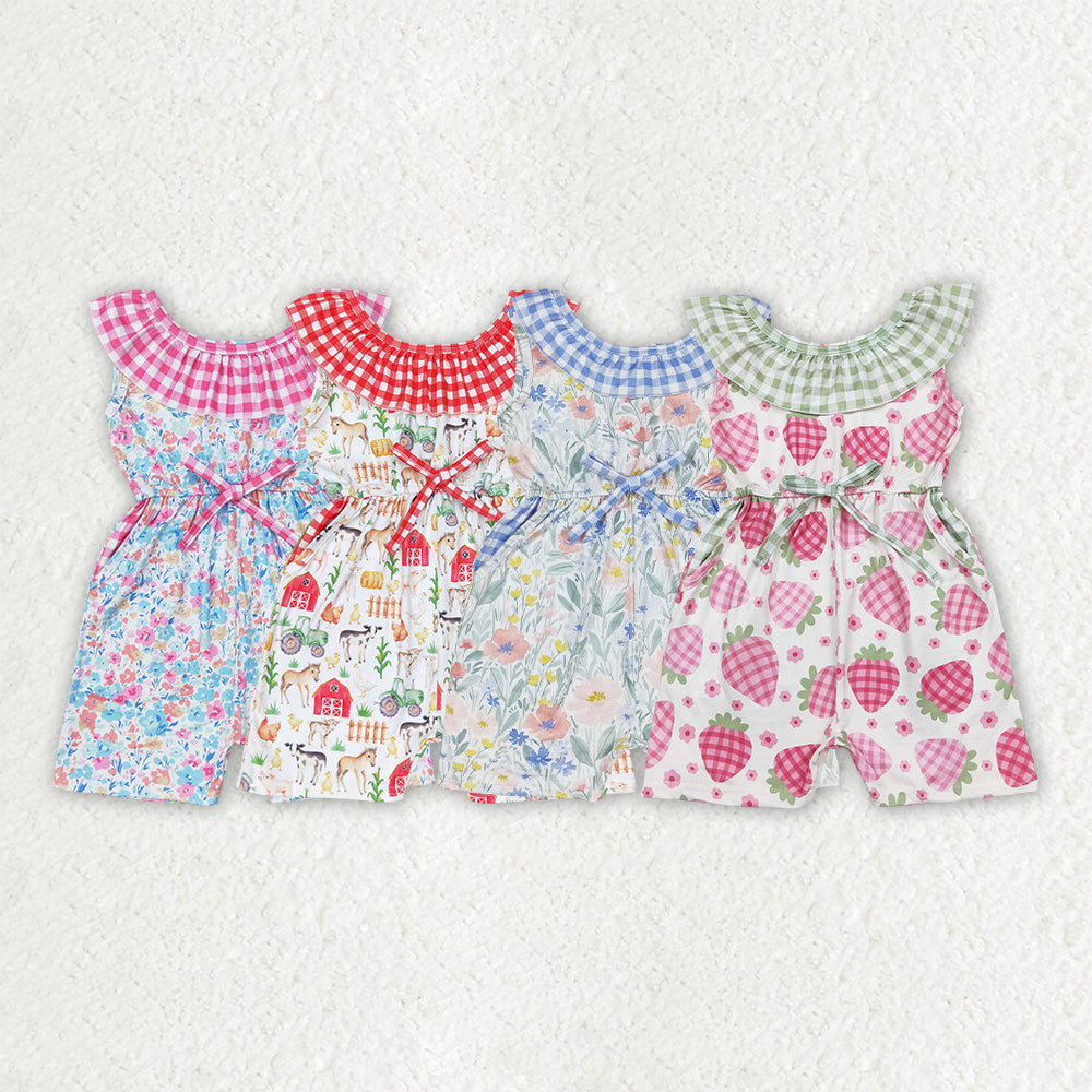 Flowers Print Girls Neck Summer Pockets Jumpsuits Sisters Wear