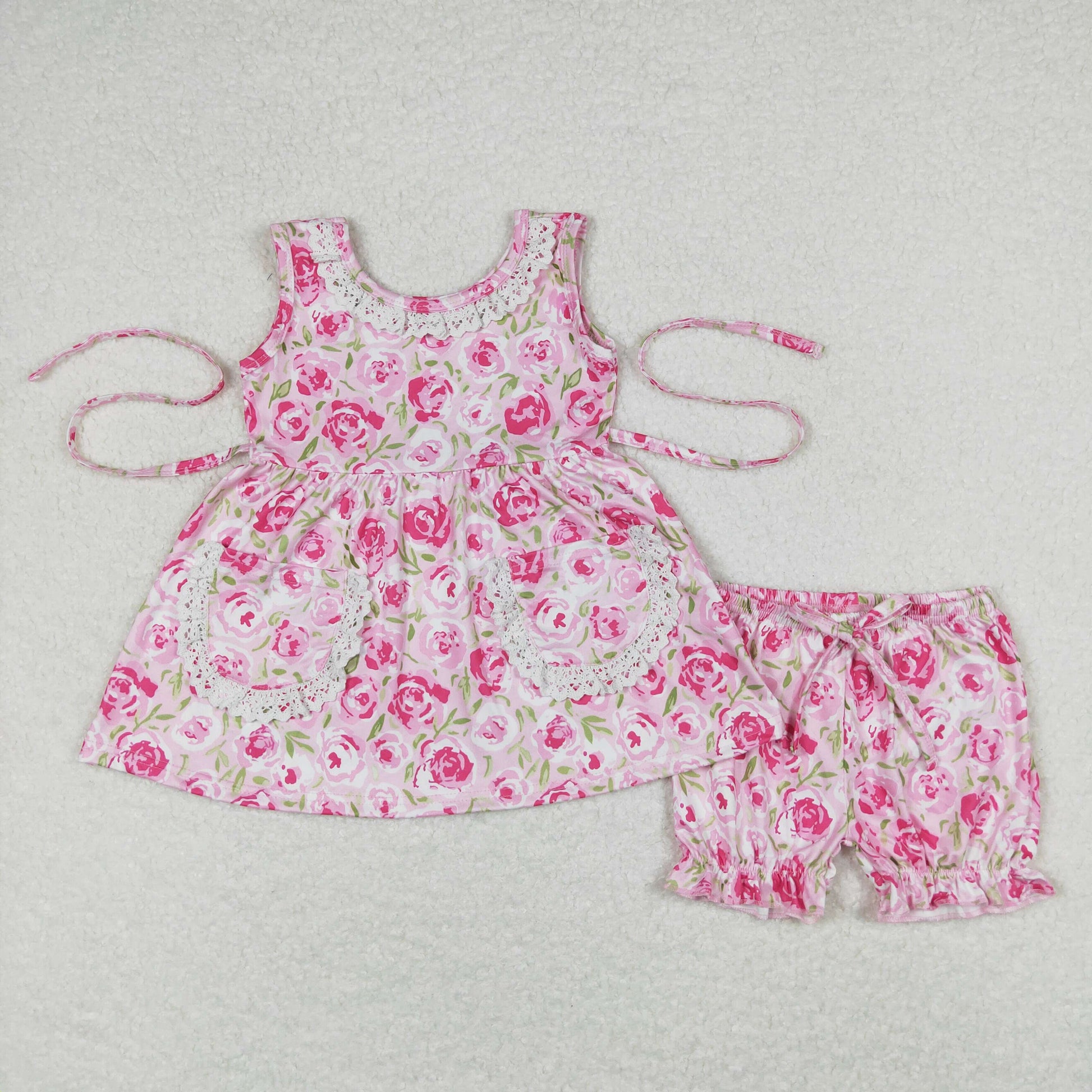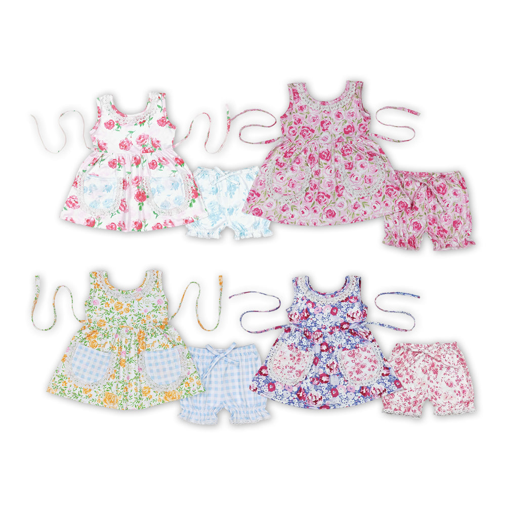 Flowers Print Pockets Girls Summer Clothes Set Sisters Wear