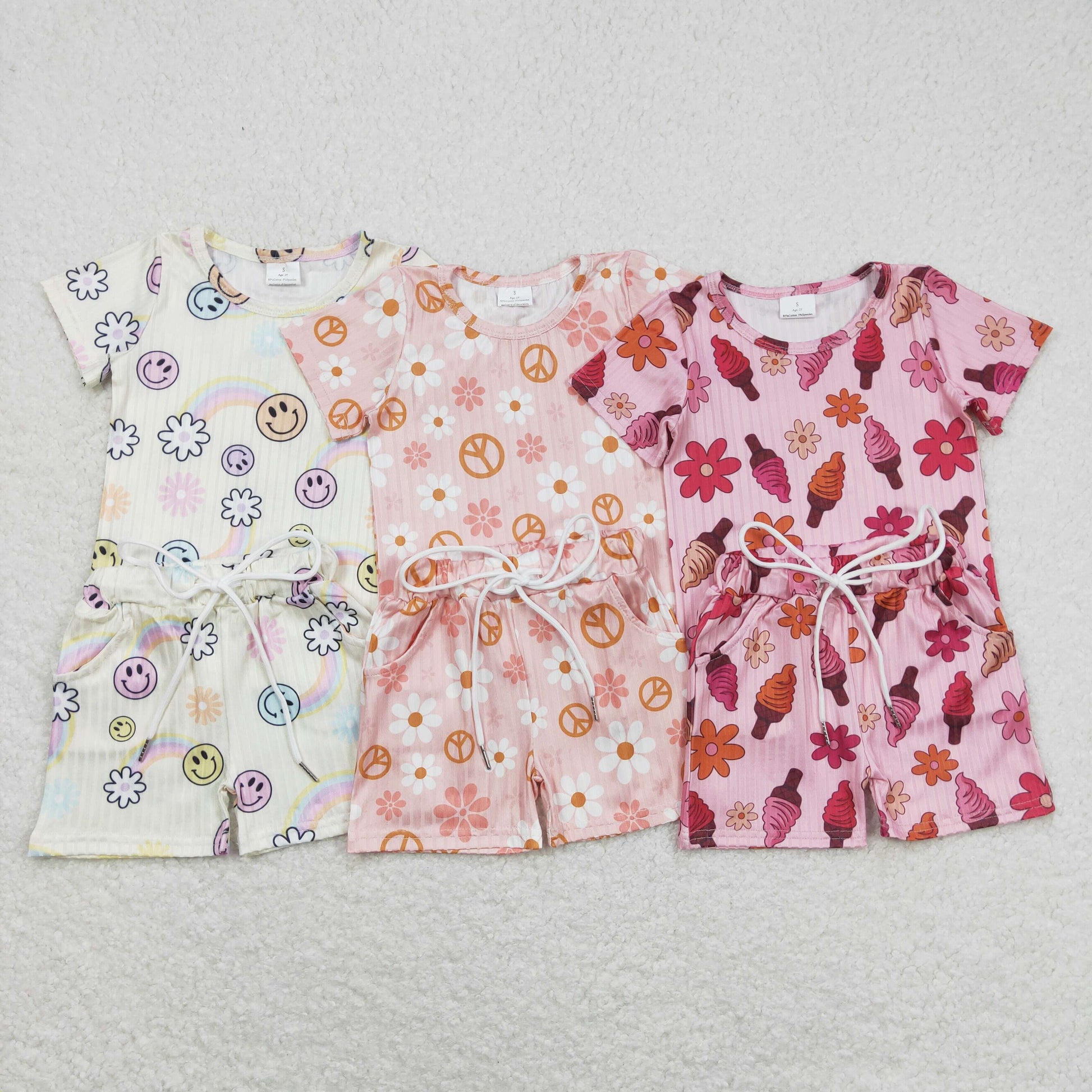 Flowers Print Pockets Girls Summer Ribbed Clothes Set Sisters Wear
