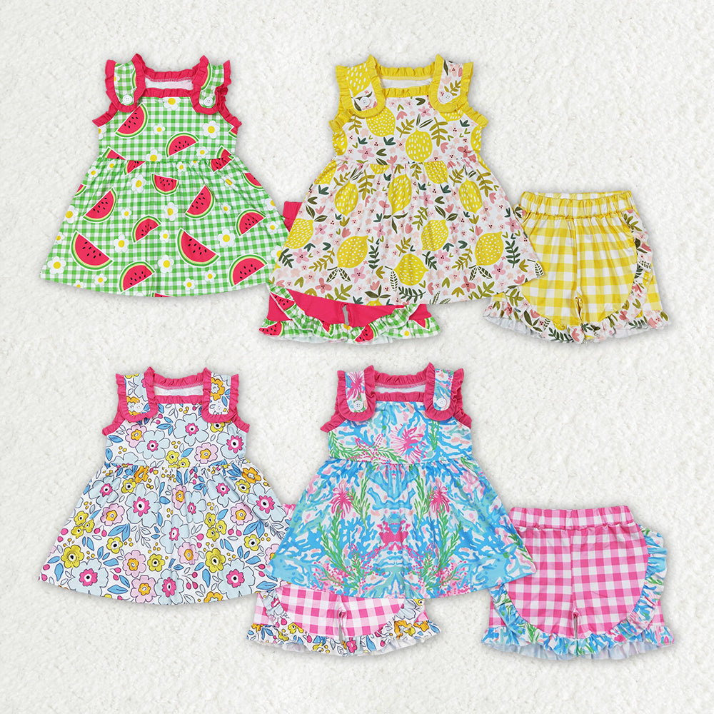 Flowers Tunic Top Plaid Shorts Girls Summer Clothes Set Sisters Wear