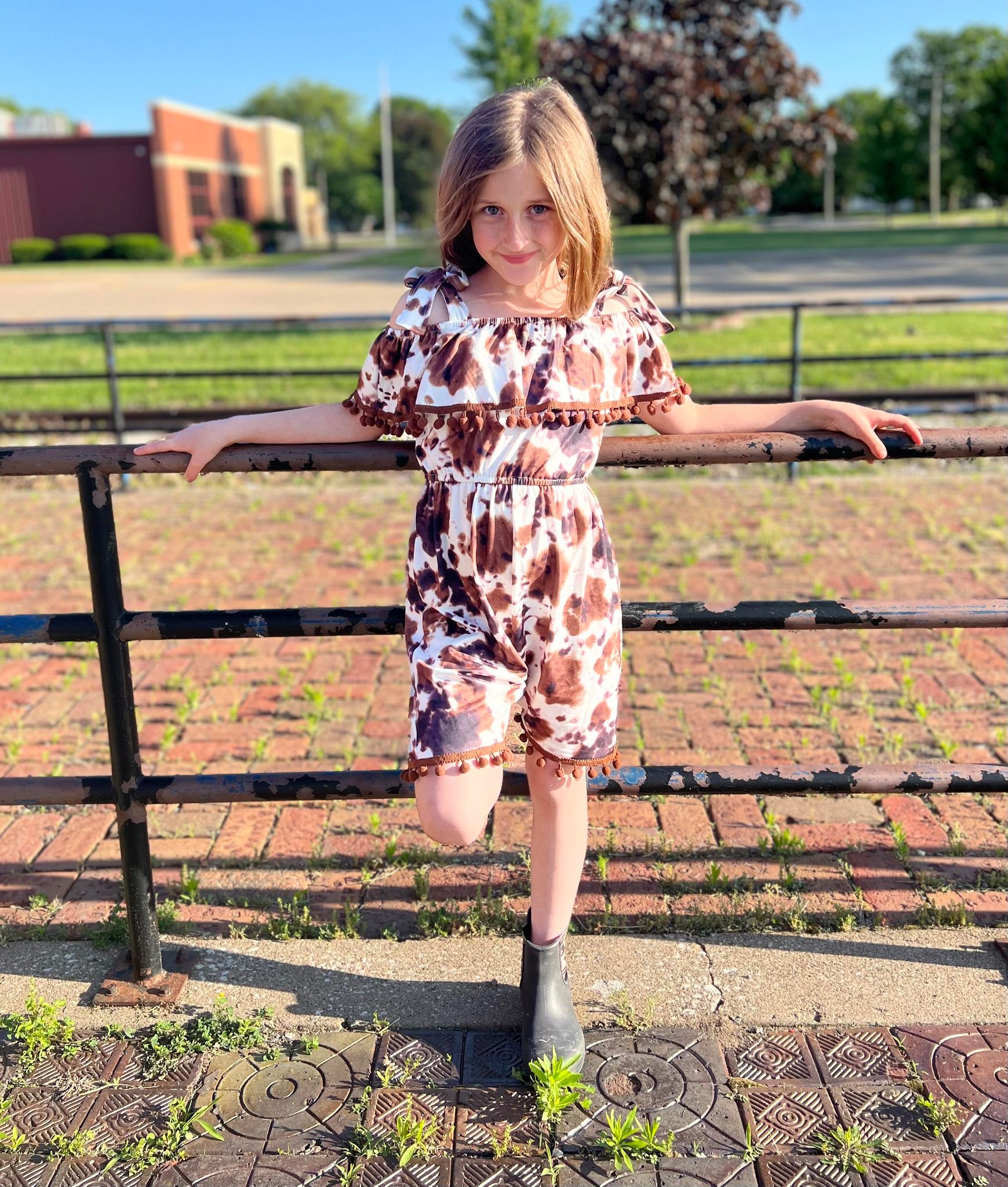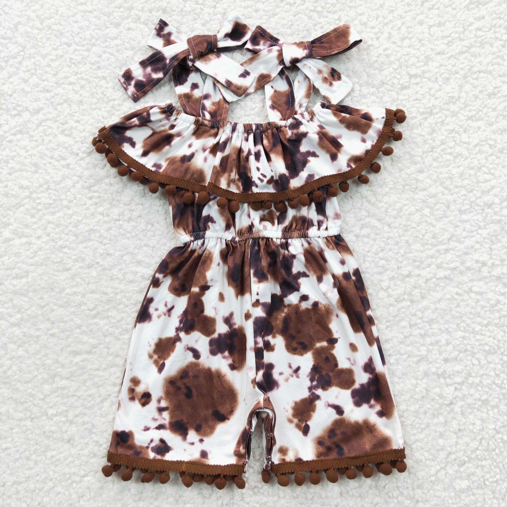 Girls brown cow print summer pompom jumpsuit SR0307