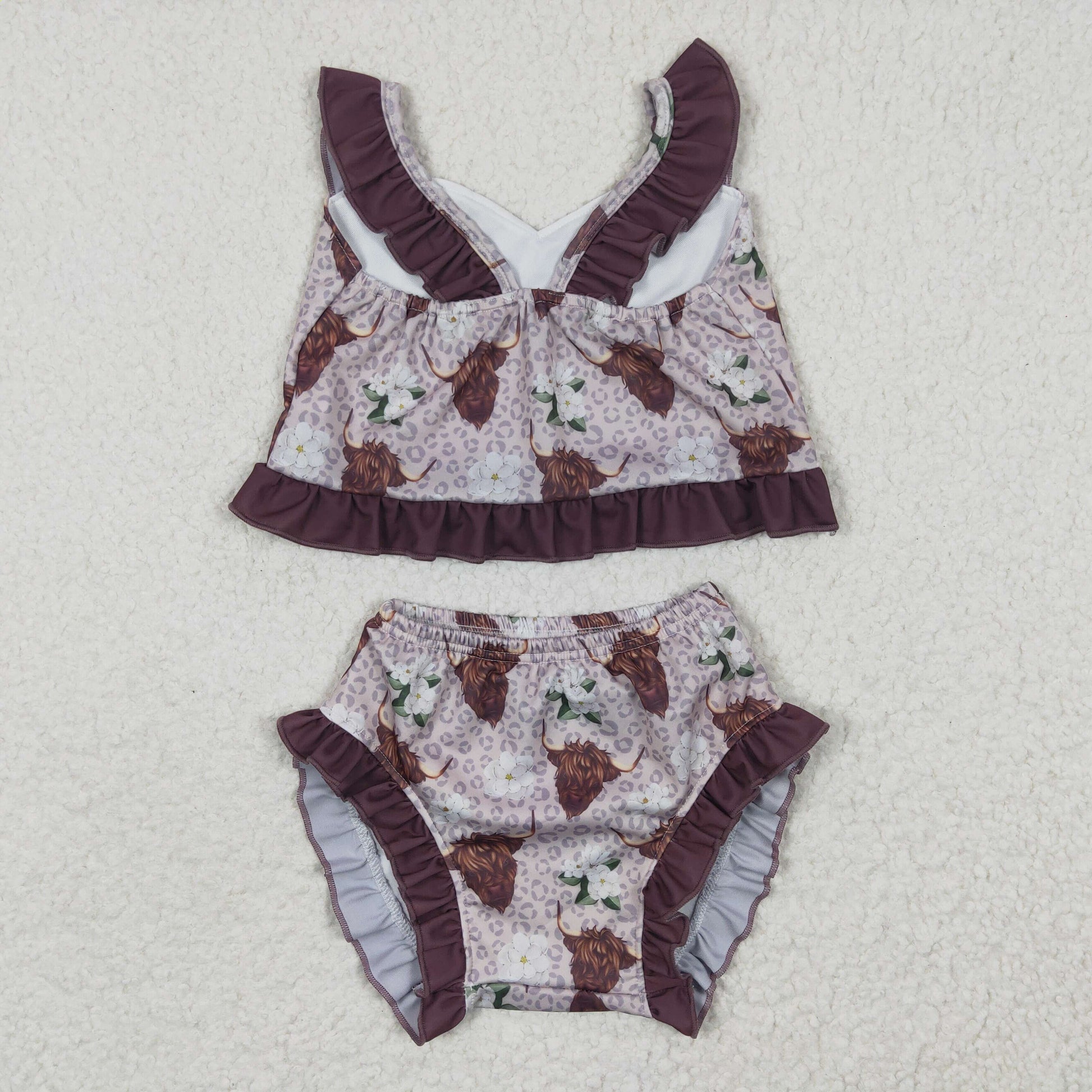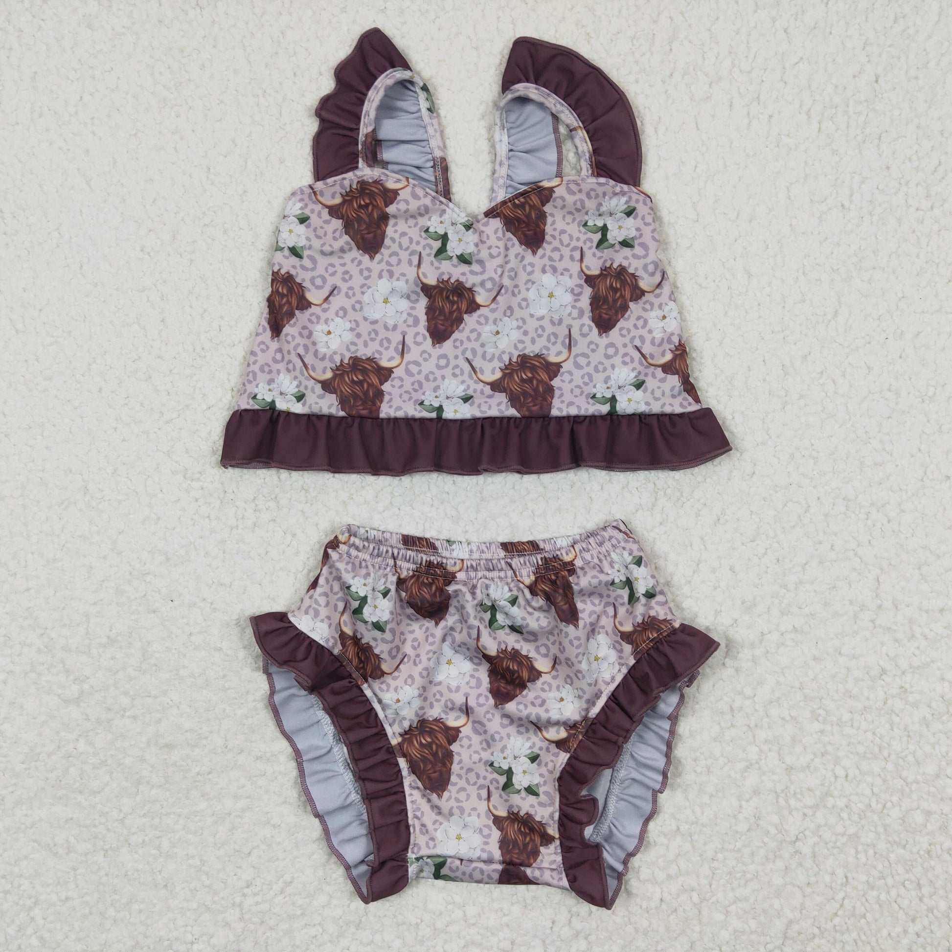 Girls brown highland cow print 2 pieces swimsuits S0103