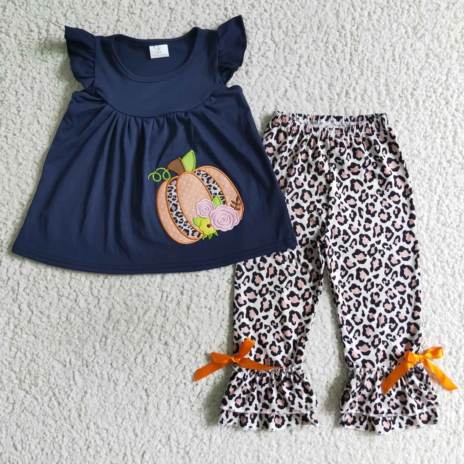 Girls fall leopard print pumpkin embroidery outfits GSPO0133