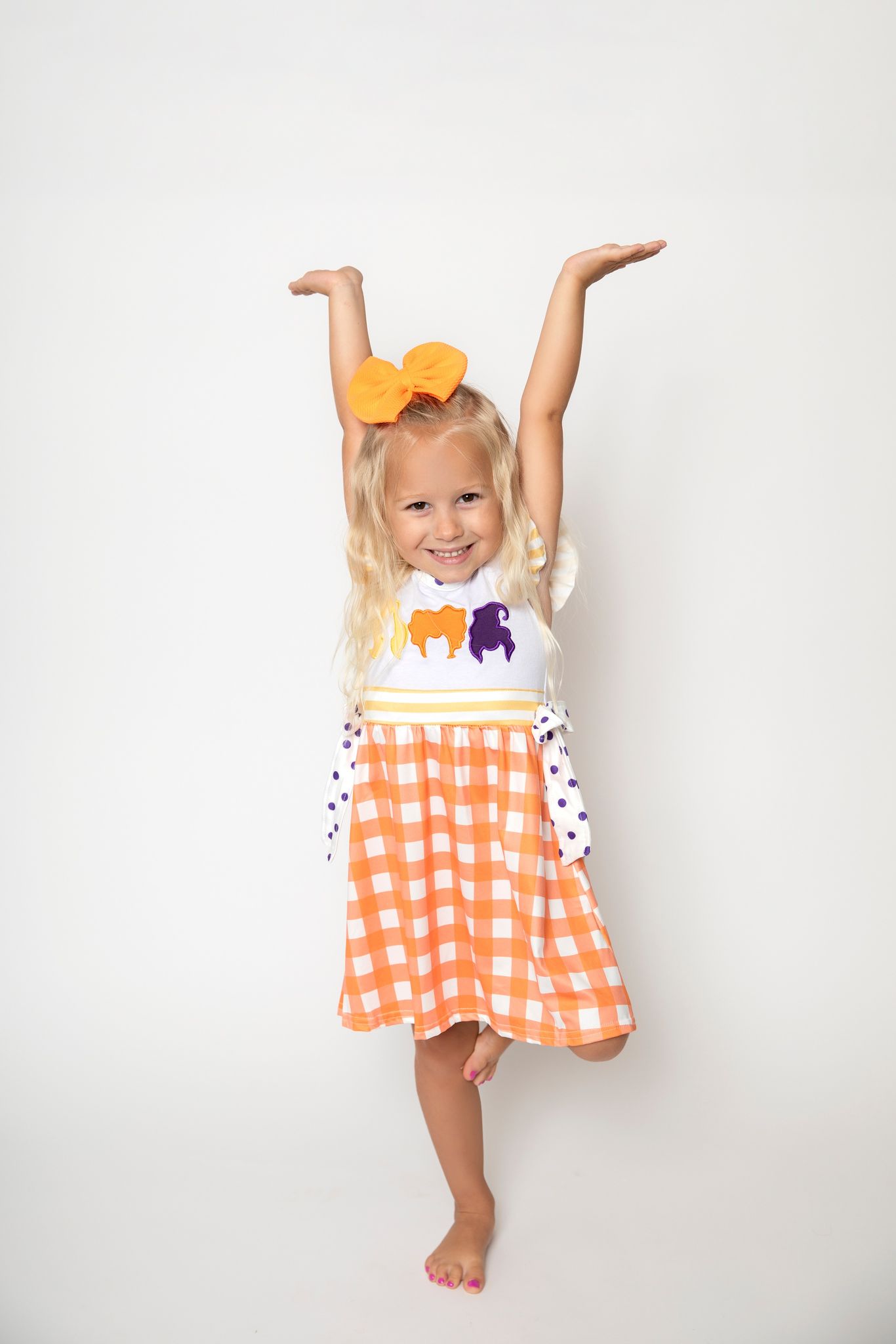 Girls flutter sleeves knee length orange plaid Halloween dress GSD0382