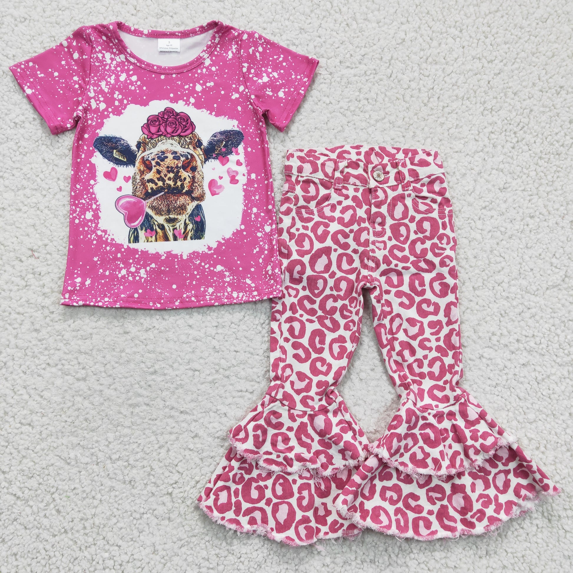 Girls hot pink cow heart print Valentine's Day top pink leopard denim pants outfits