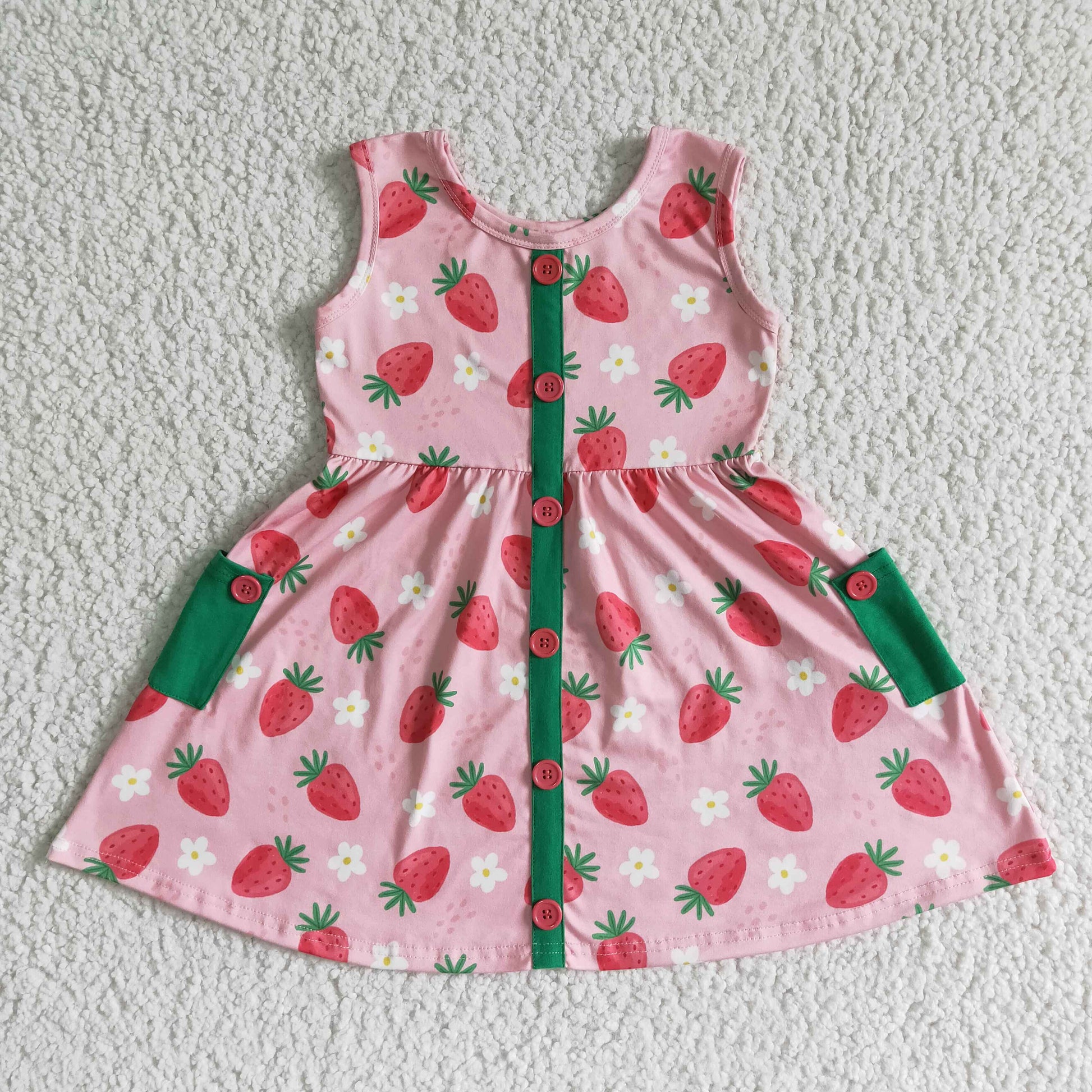 (Promotion)Girls strawberry print sleeveless pockets knee length dress GSD0037