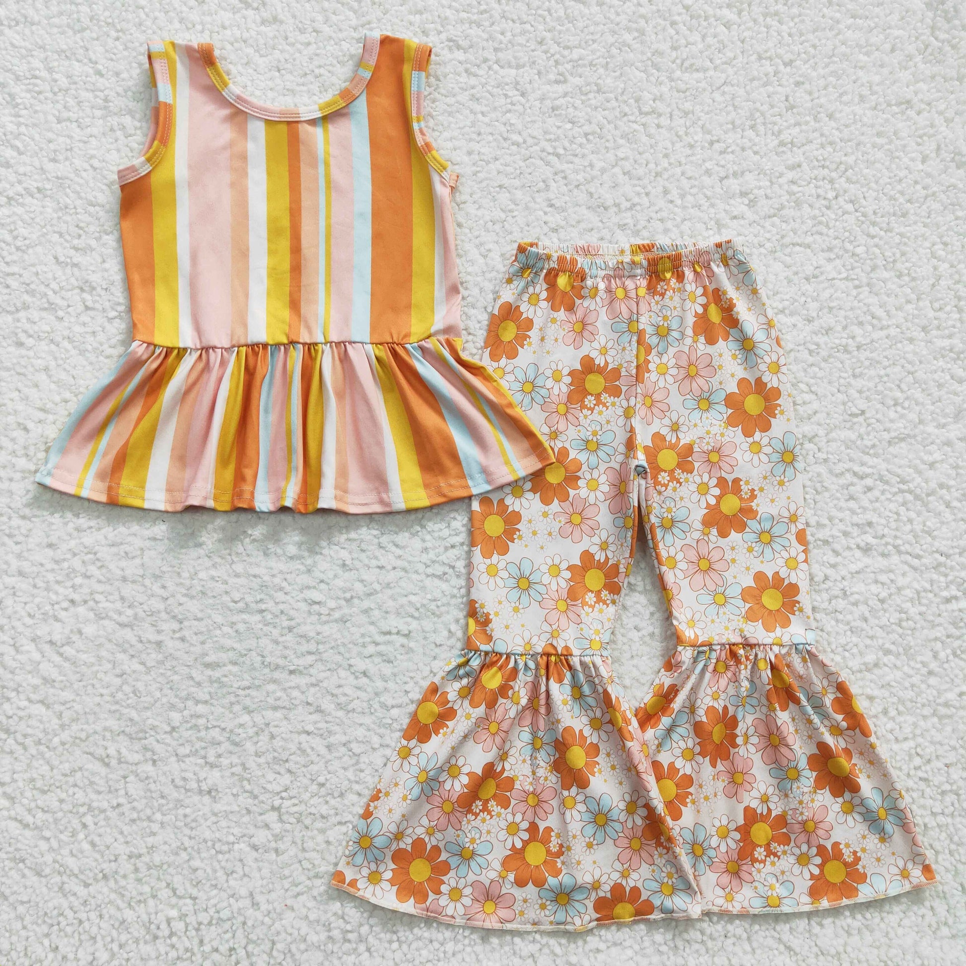 Girls stripes top orange floral bell bottom pants Clothes set GSPO0509