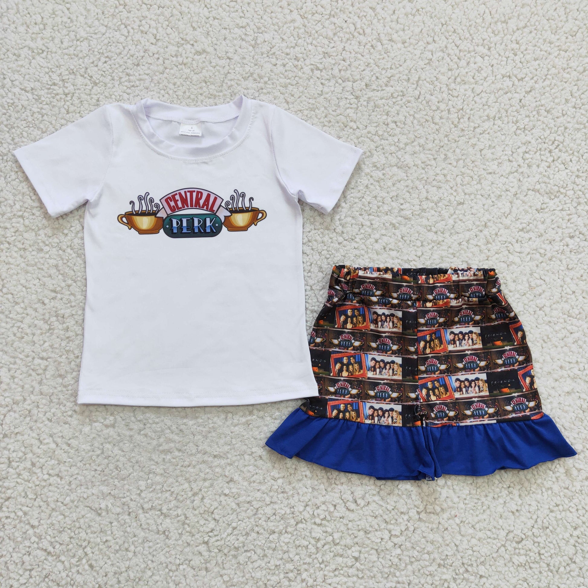 Girls summer screen print shirt ruffle shorts friends outfits C3-2