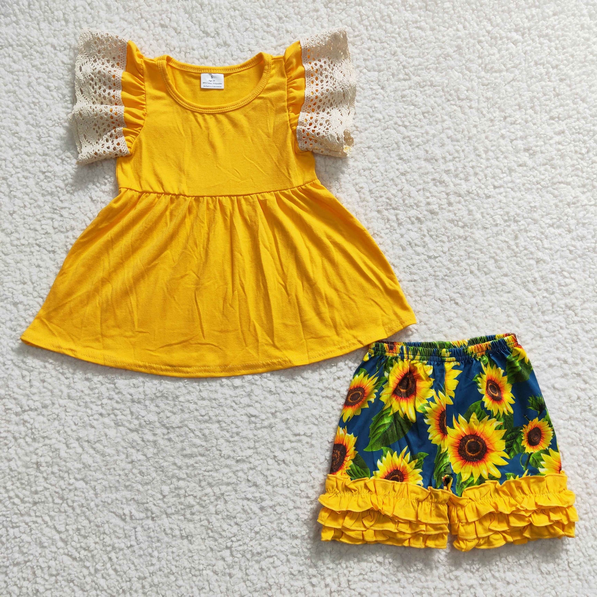 (Promotion) Girls yellow flutter sleeve cotton top sunflower shorts summer outfits A10-24