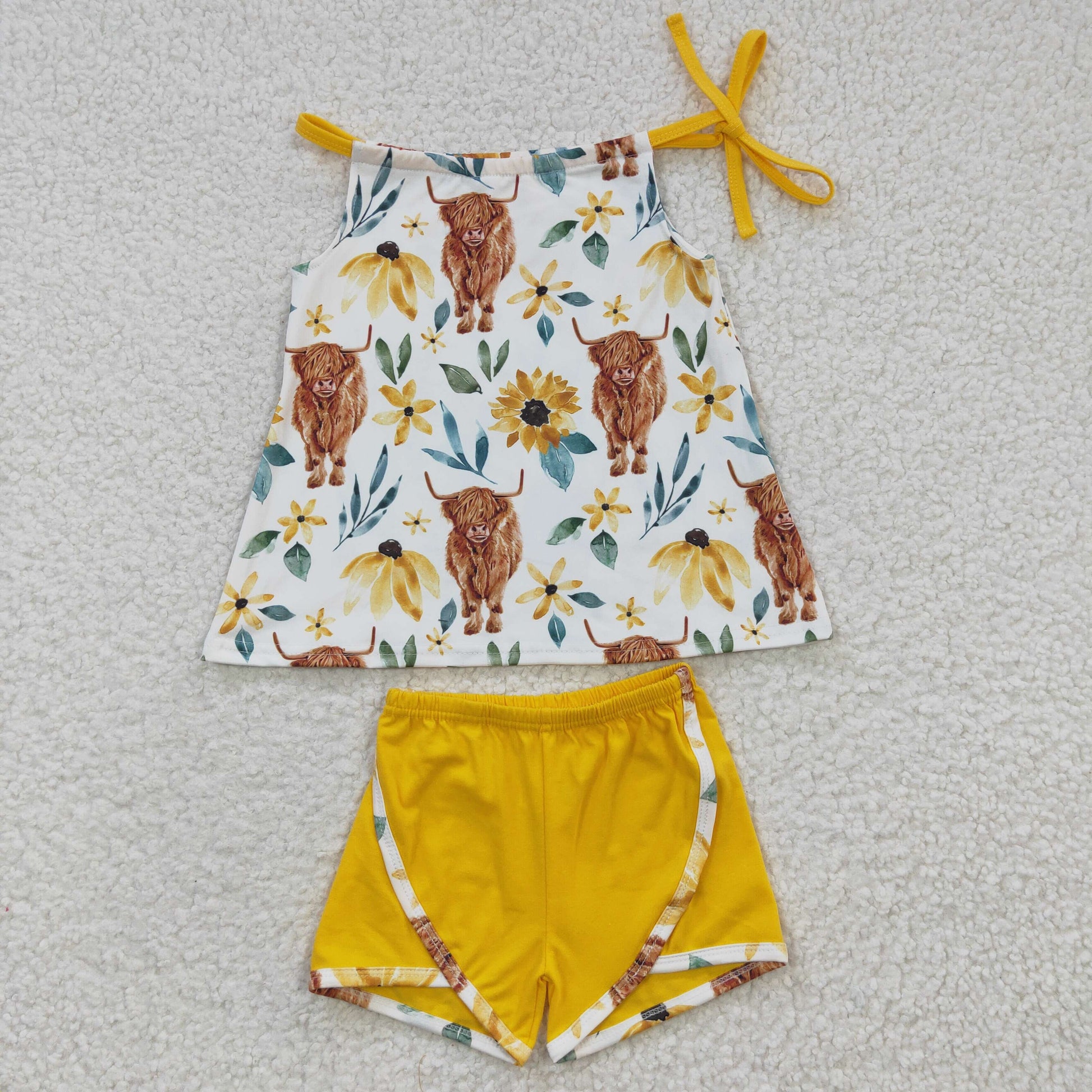 Girls yellow highland cow floral summer shorts sets GSSO0207