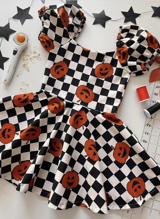 GLD0302 Black plaid pumpkin knee length Halloween dress
