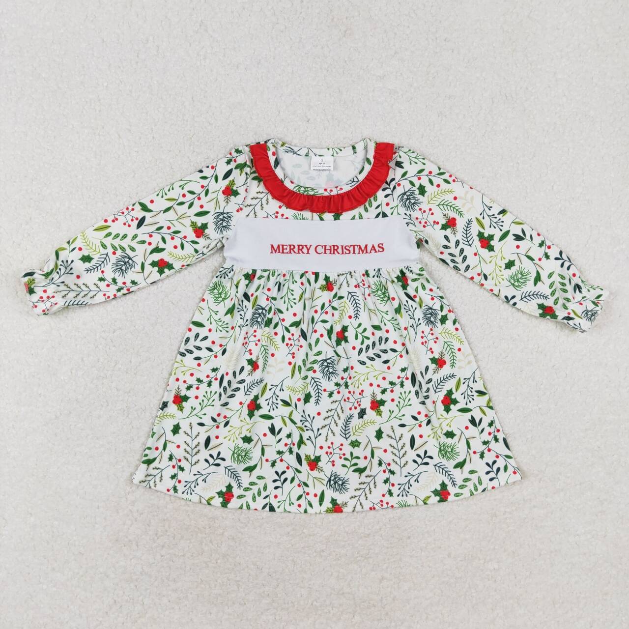 GLD0579 Merry Christmas Embroidery Holly Print Girls Knee Length Dress