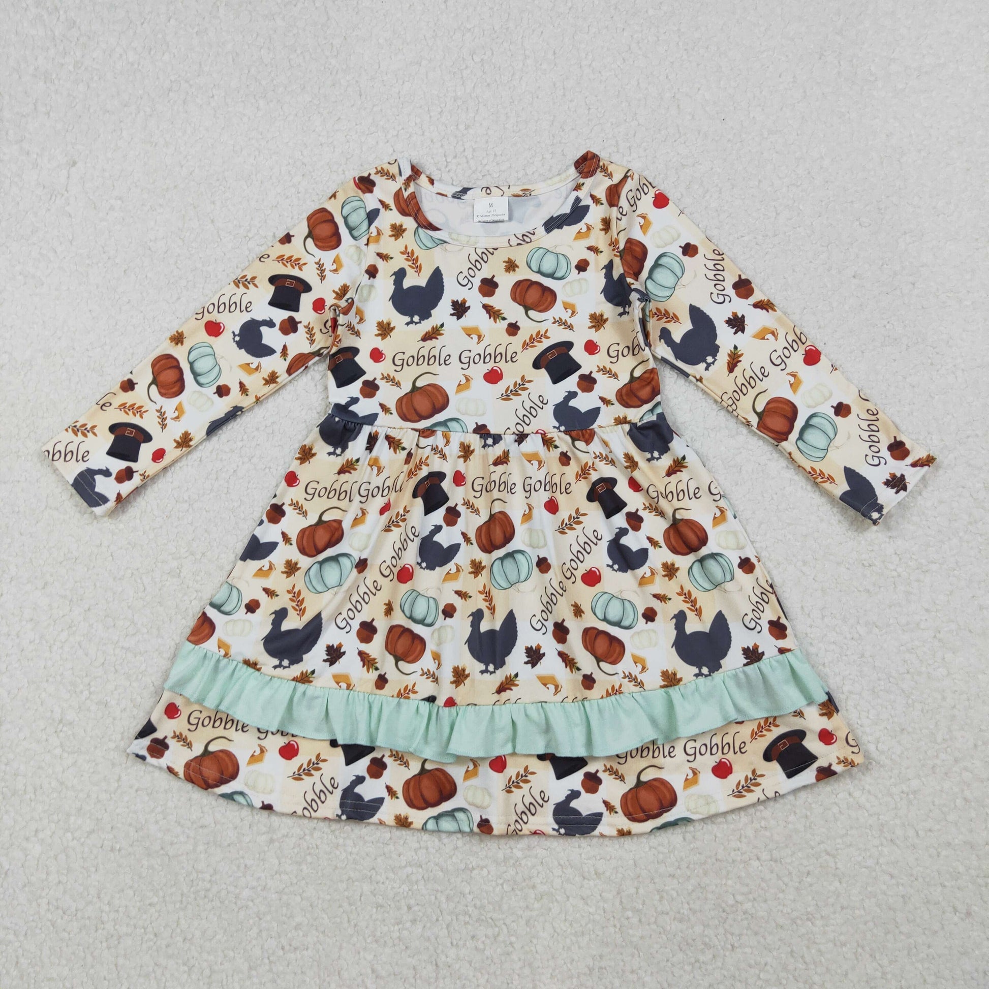 GLD0789 Gobble Turkey Pumpkin Print Girls Knee Length Thanksgiving Dress