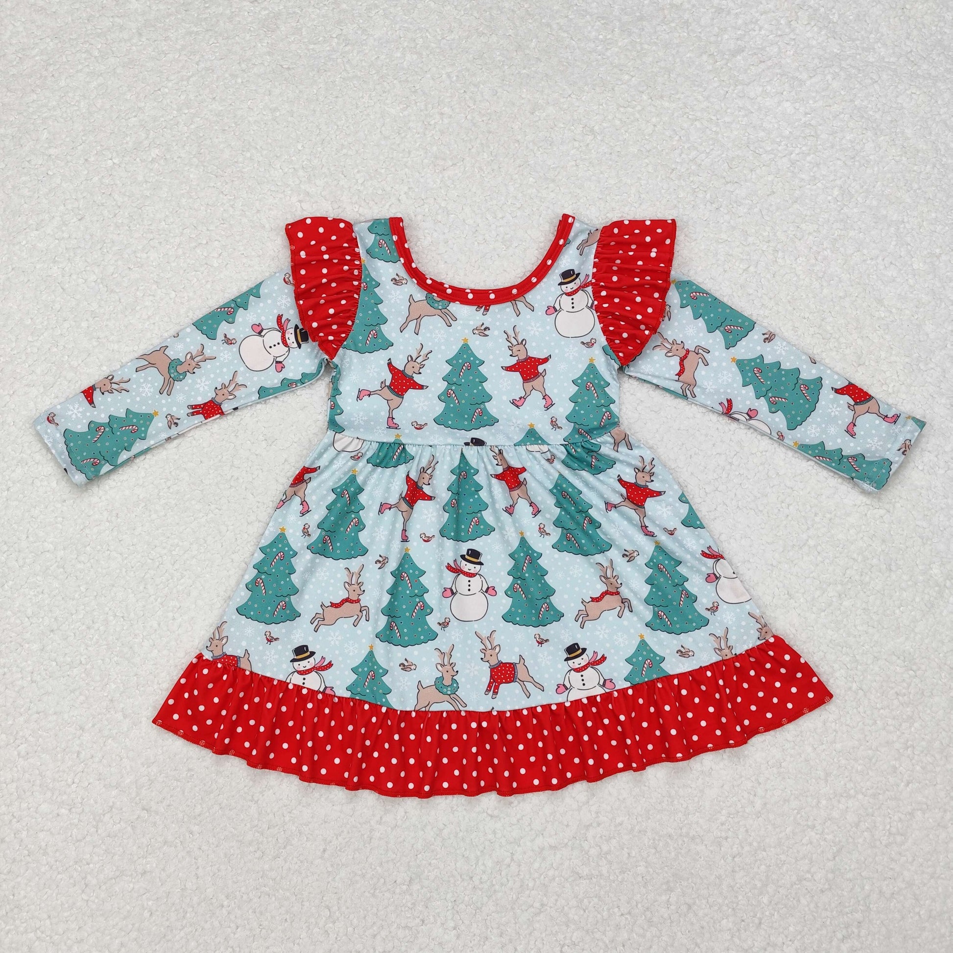 GLD0794 Snowman Deer Tree Print Girls Knee Length Christmas Dress