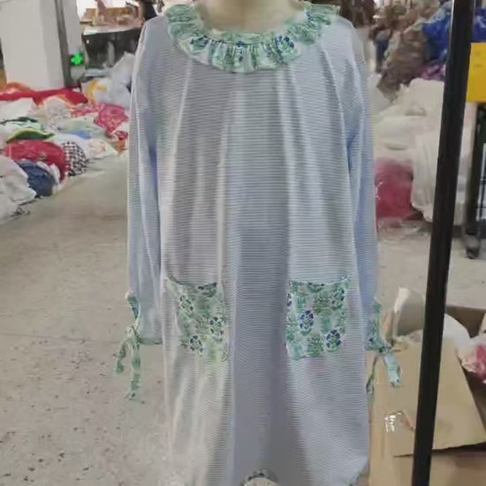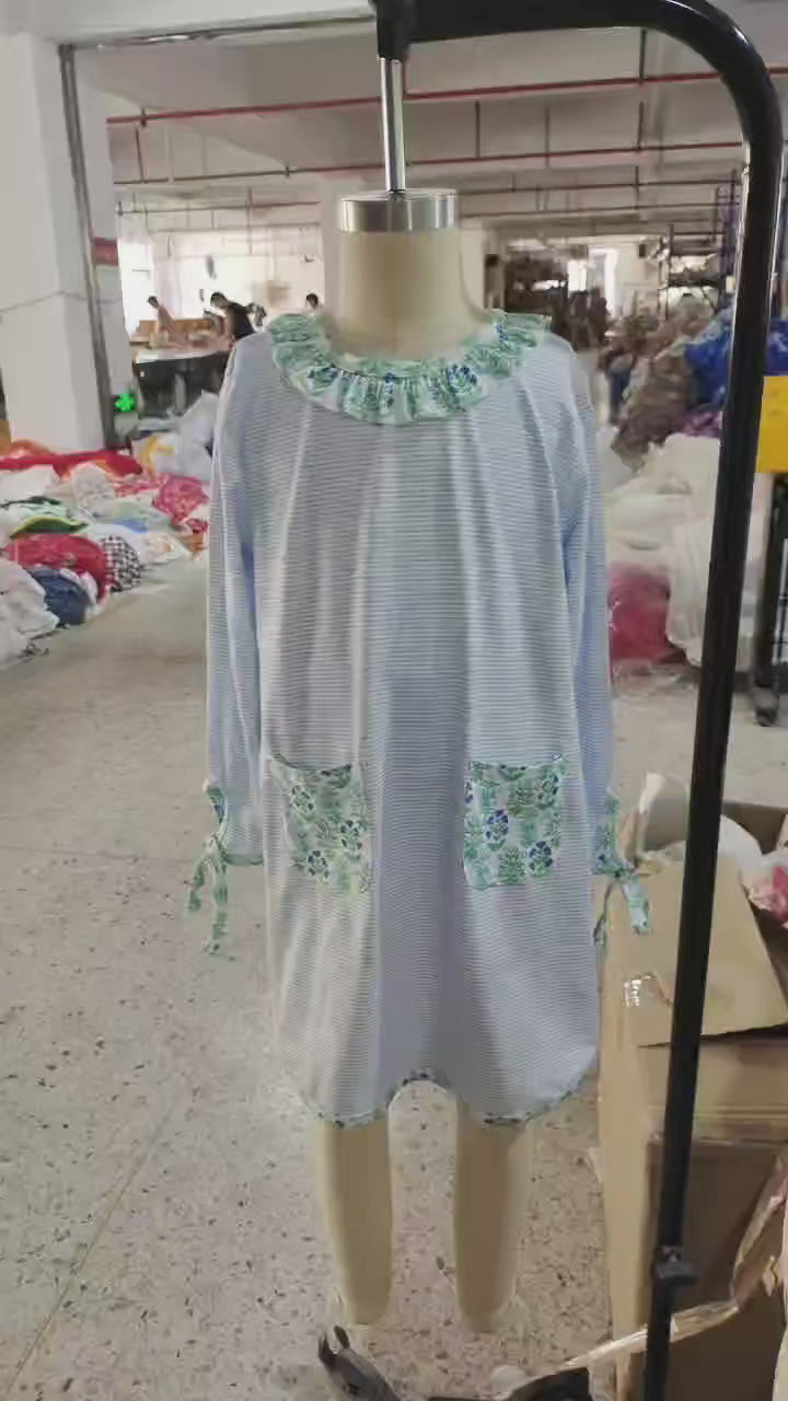GLD0927 Green Flowers Blue Stripes Print Pockets Girls Fall Knee Length Dress