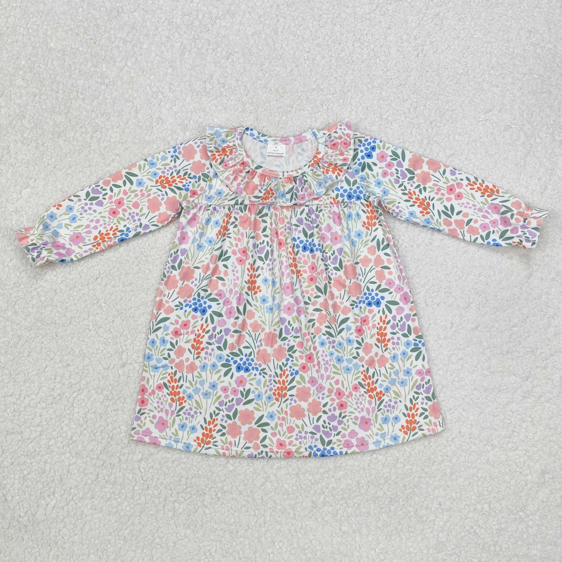 GLD0982 Colorful Flowers Print Girls Long Sleeve Spring Knee Length Dress