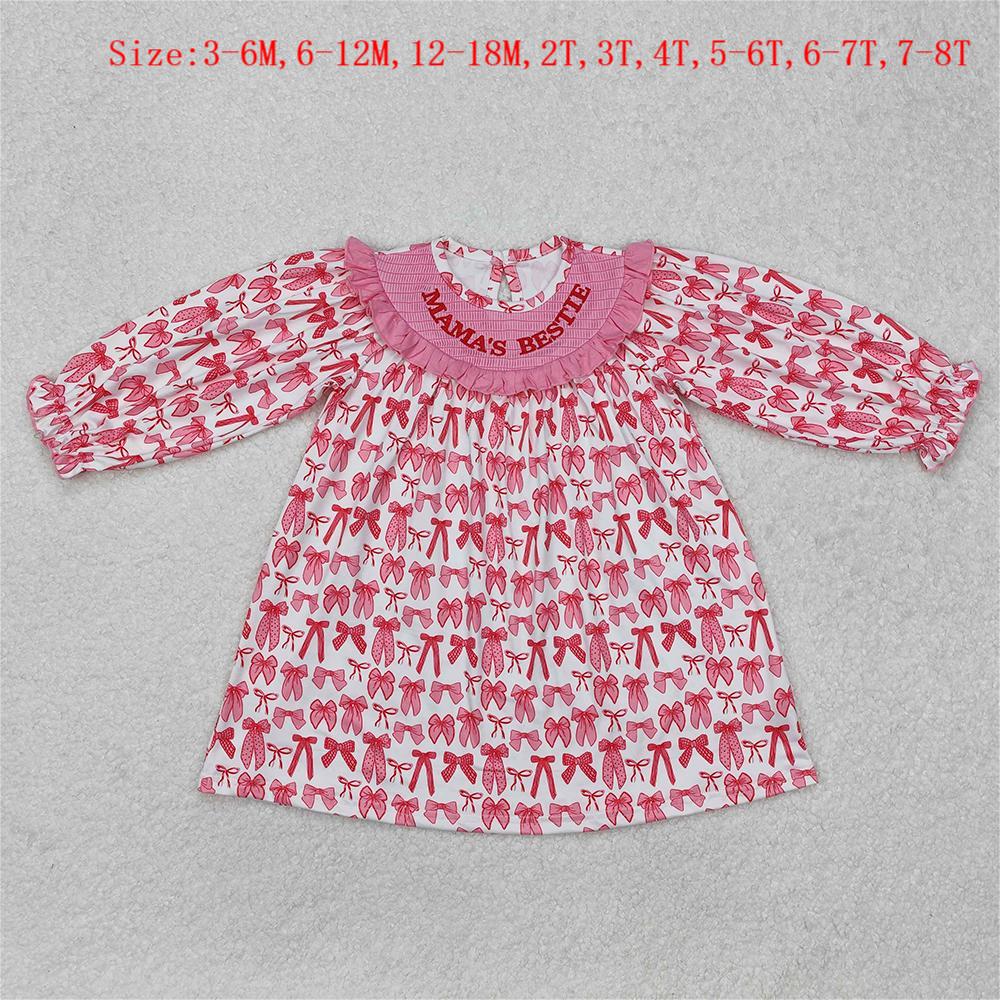 GLD0990 MAMA'S BESTIE Embroidery Pink Bows Print Smocked Girls Long Sleeve Knee Length Dress