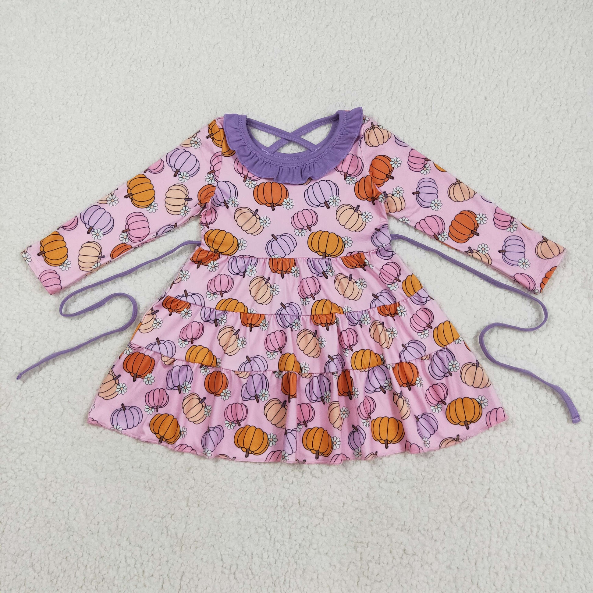 GLD1032 Pumpkin Flowers Print Girls Fall Knee Length Dress