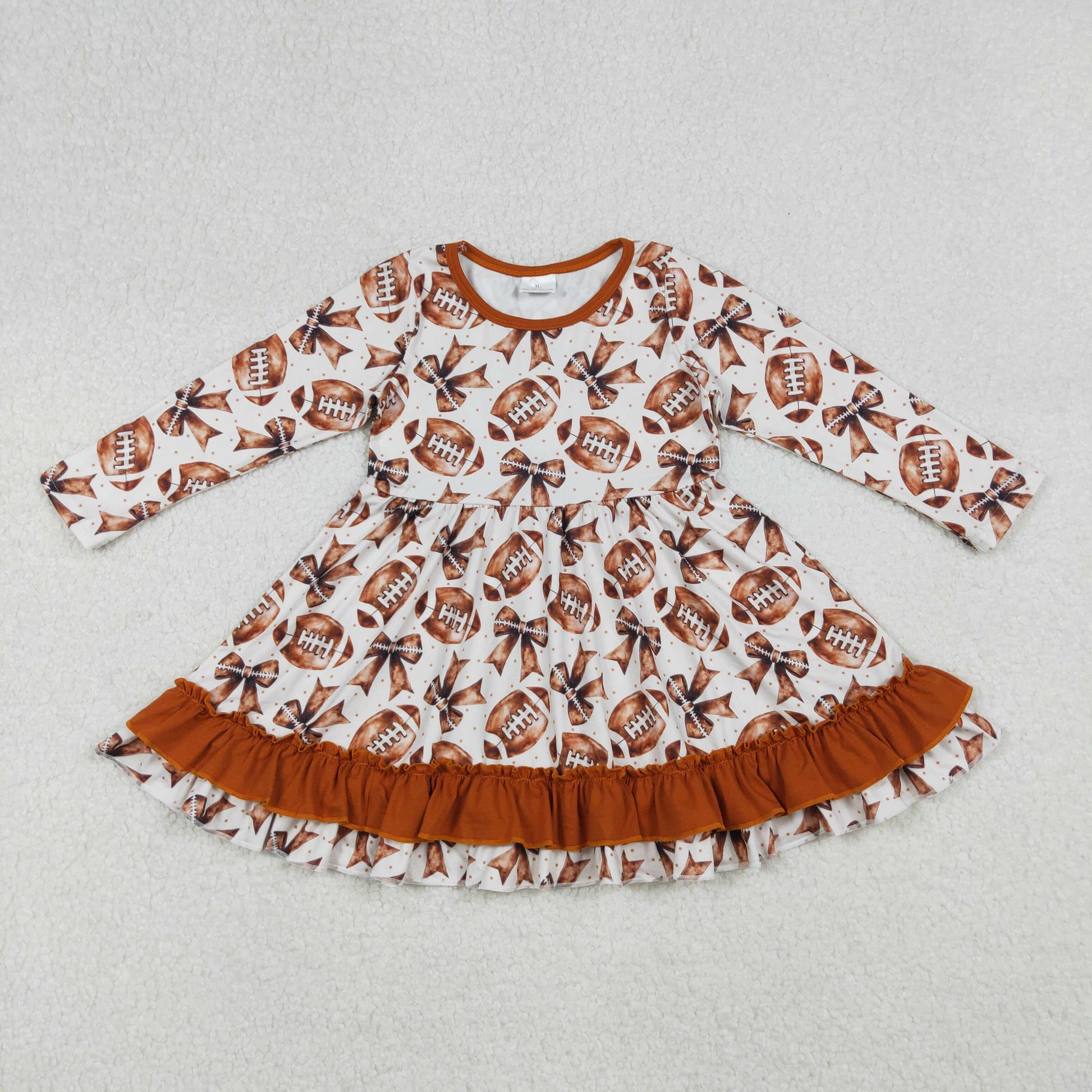 GLD1268 Football Bows Brown Print Girls Fall Knee Length Dress
