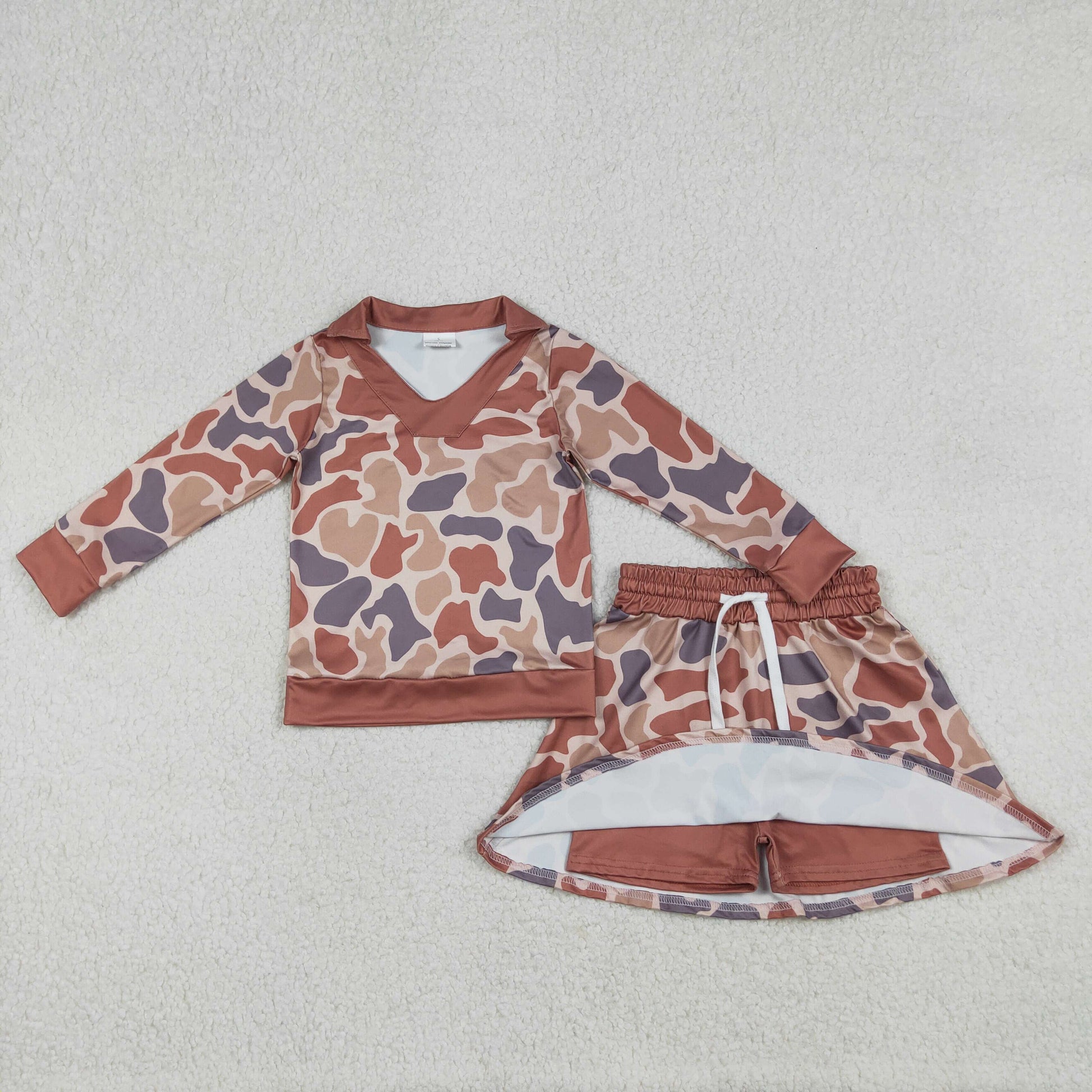 GLD1476 Brown Camo Top Skirts Shorts Girls Hunting Clothes Set