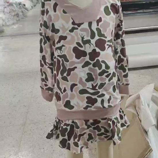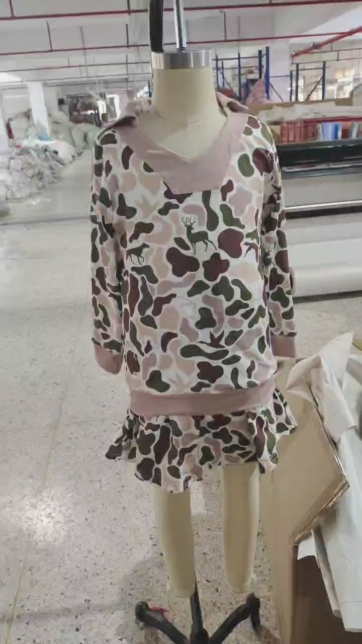 GLD1480 Khaki Camo Long Sleeve Top Skirts Shorts Girls Clothes Set