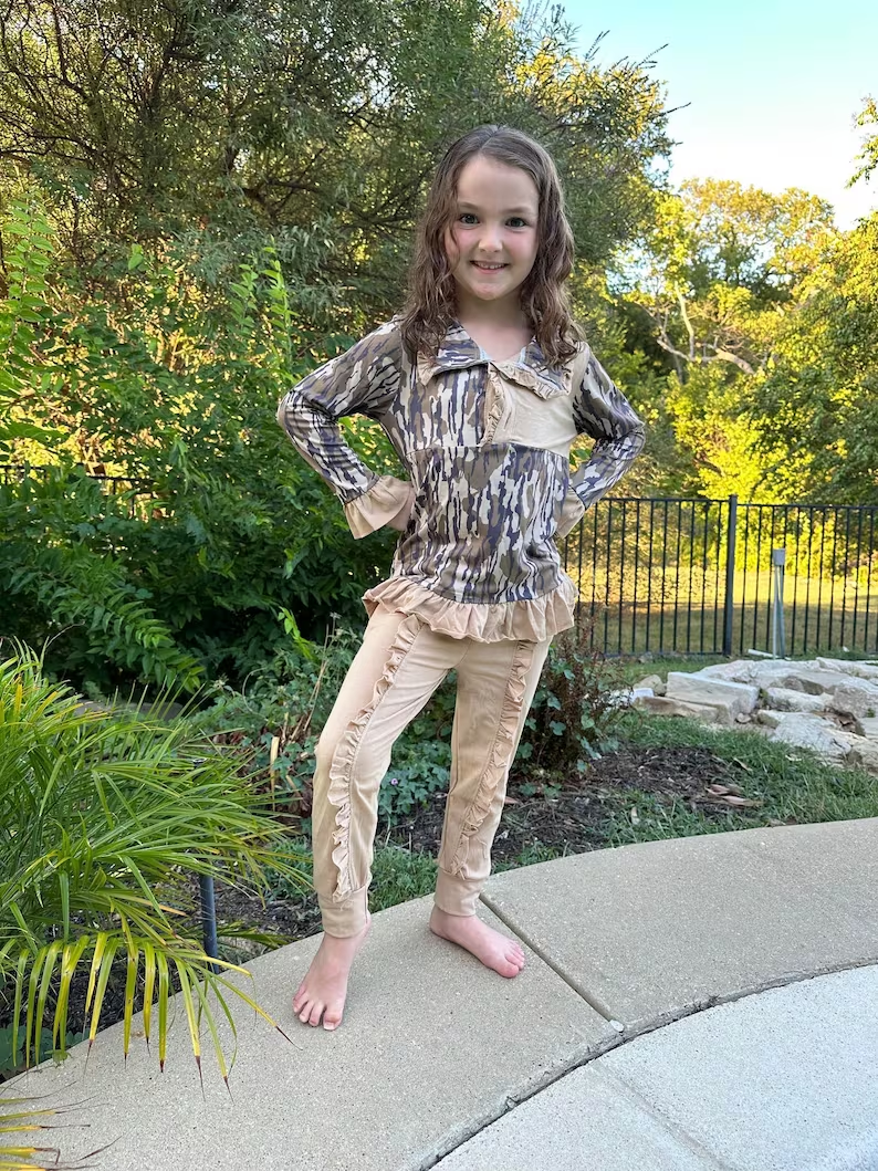 GLP0593 Girls camo print button pullover shirts ruffle pants fall clothes set
