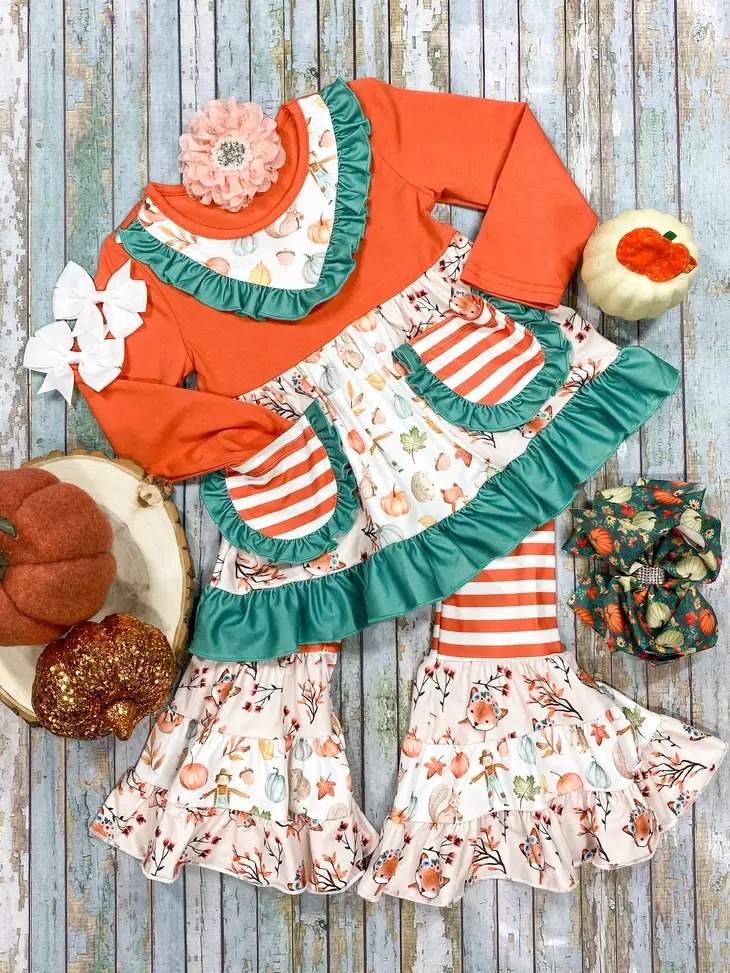 GLP0743 Orange pumpkin pockets girls bell pants fall clothes set