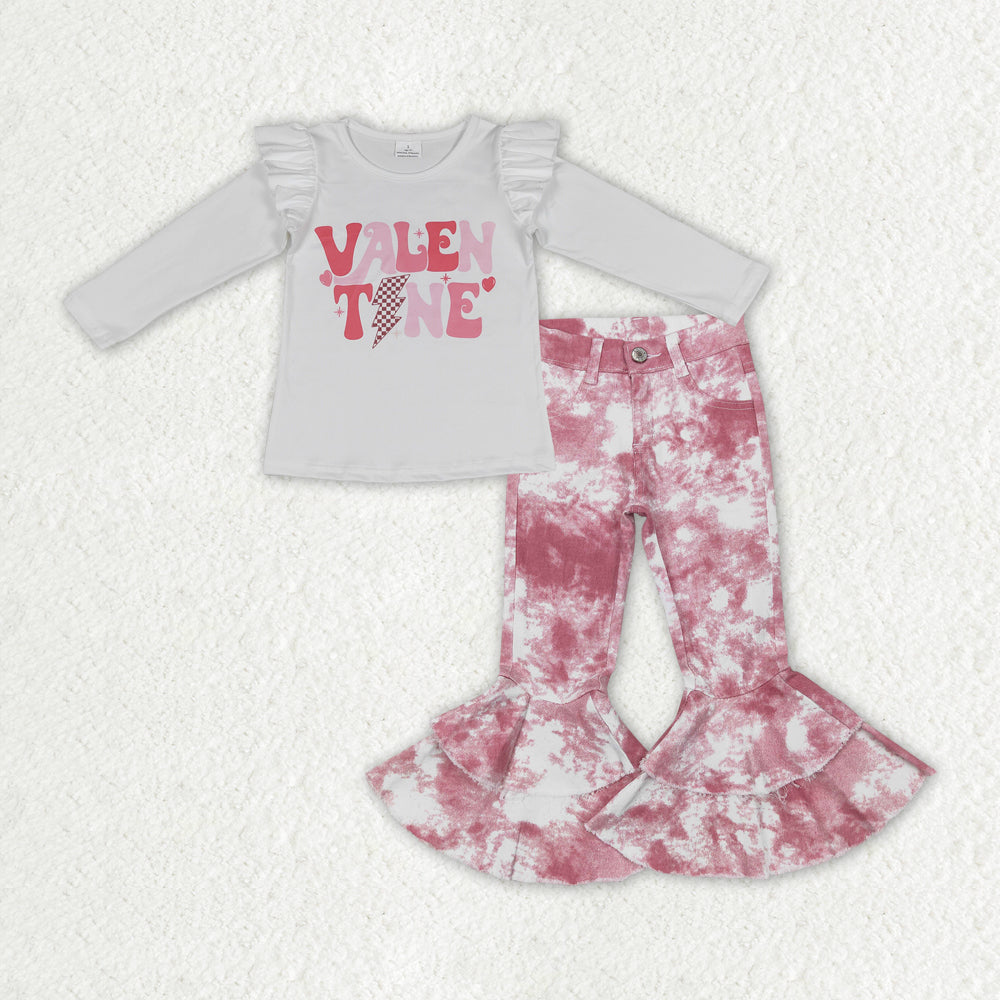 GLP1160 VALENTINE Top Pink Tie-dye Denim Bell Bottom Jeans Girls Valentine's Clothes Set