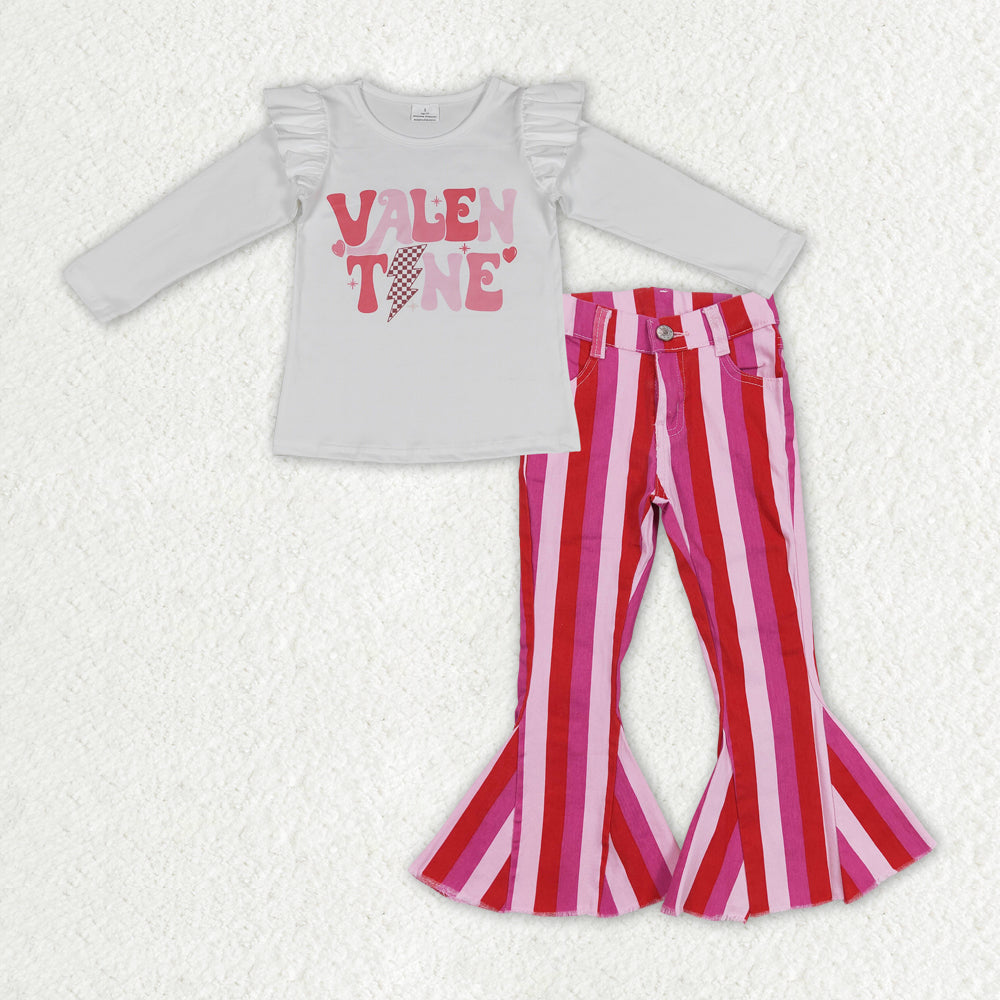 GLP1162 VALENTINE Top Pink Stripes Denim Bell Bottom Jeans Girls Valentine's Clothes Set