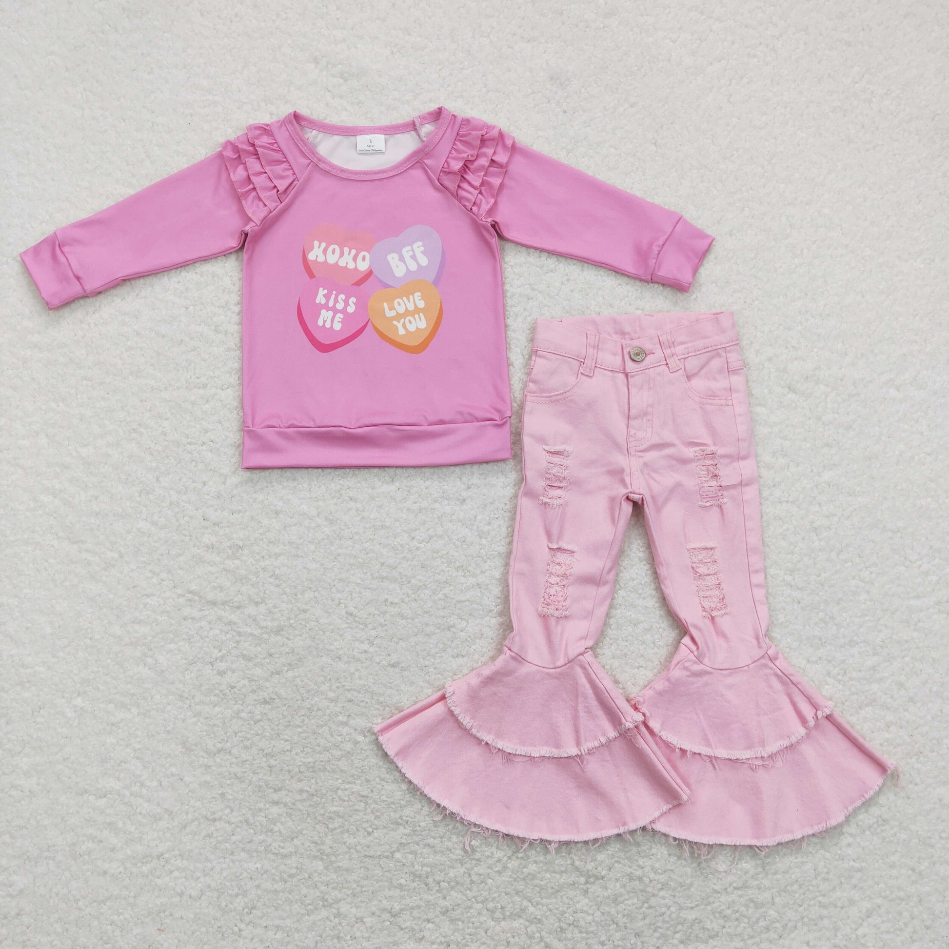 GLP1165 Heart Ruffles Top Pink Denim Hole Jeans Girls Valentine's Clothes Set