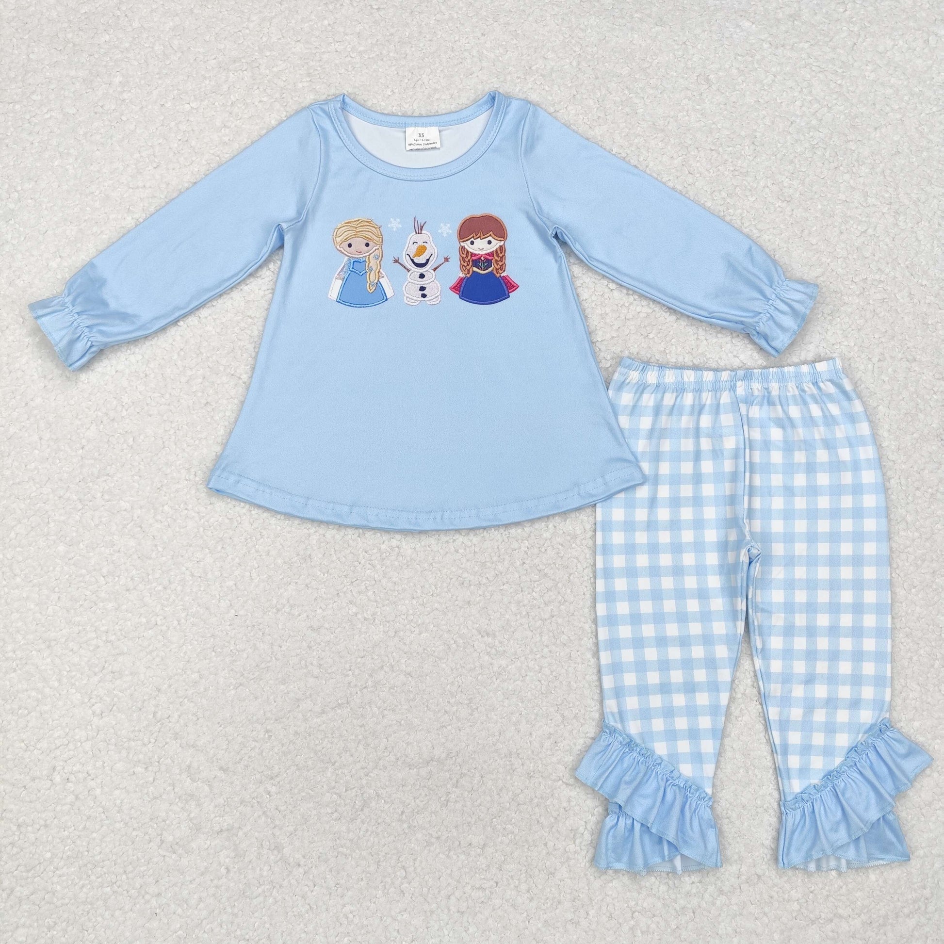 GLP1484 Cartoon Princess Blue Tunic Top Plaid Pants Girls Fall Clothes Set