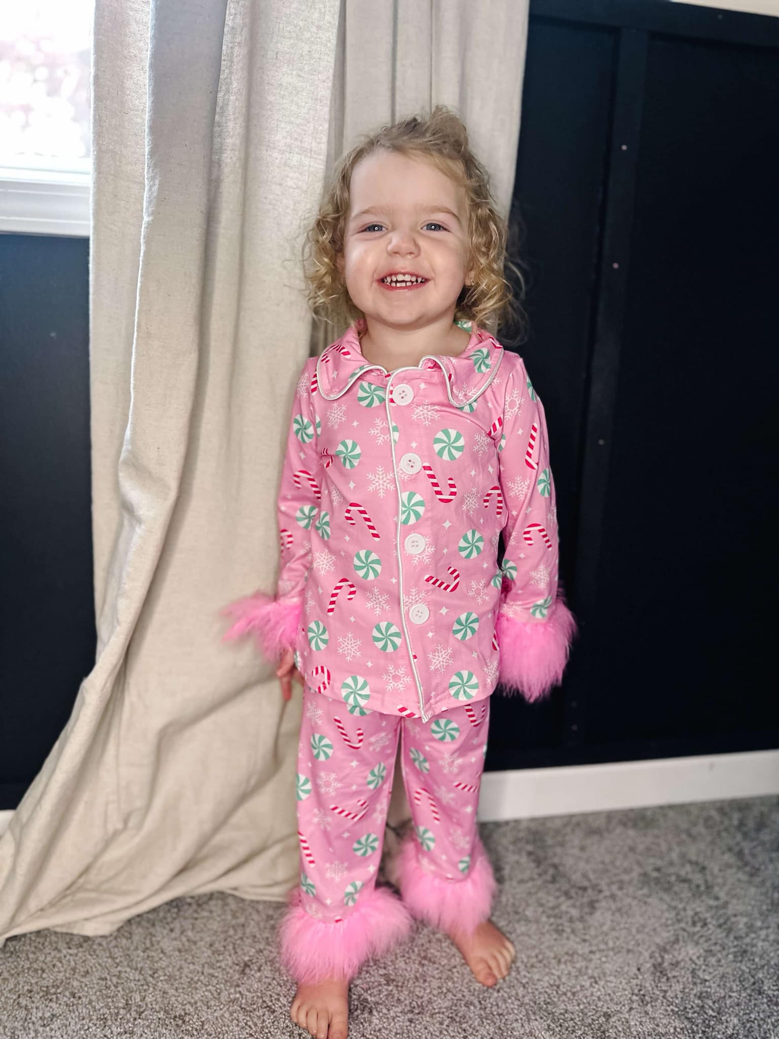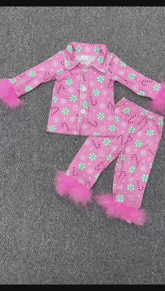 GLP2025 Candy Pink Print Girls Christmas Buttons Fur Pajamas Clothes Set
