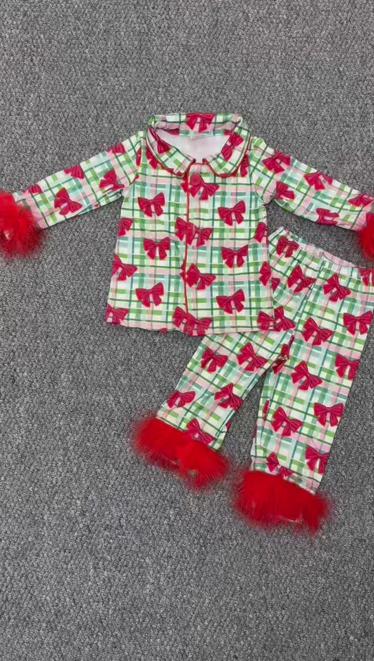 GLP2372 Red Bows Green Plaid Print Girls Christmas Buttons Fur Pajamas Clothes Set