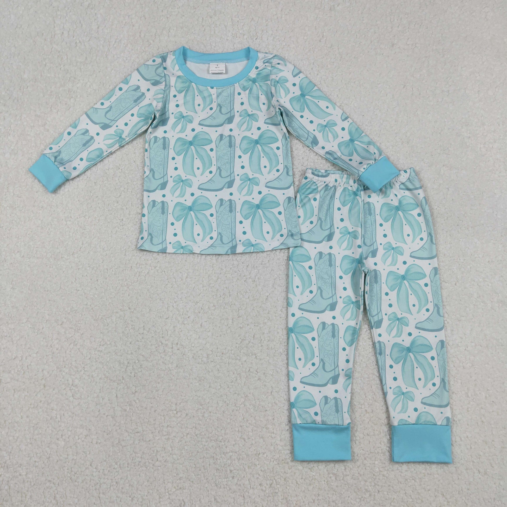 GLP2732 Blue Bows Boots Print Girls Western Pajamas Clothes Set