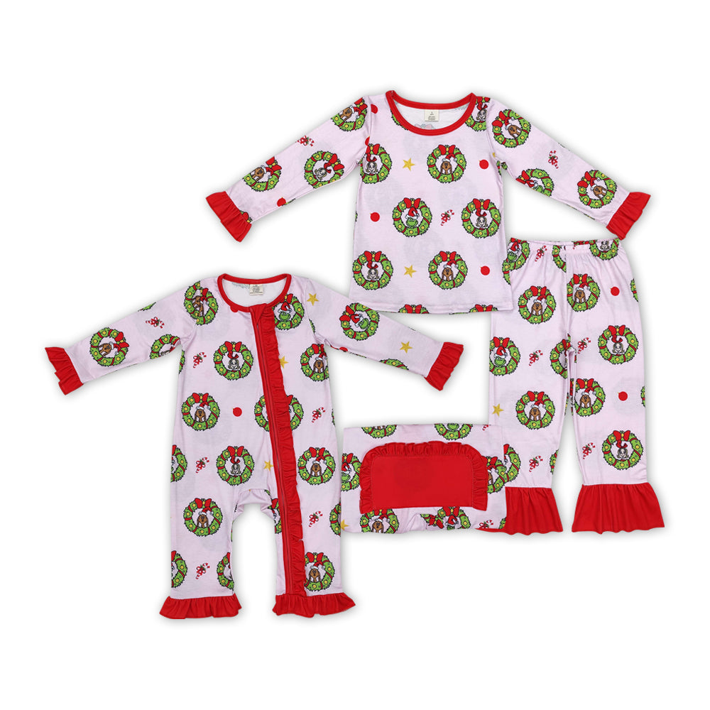 Green Frog Holly Flowers Print Sisters Christmas Bamboo Matching Pajamas Clothes
