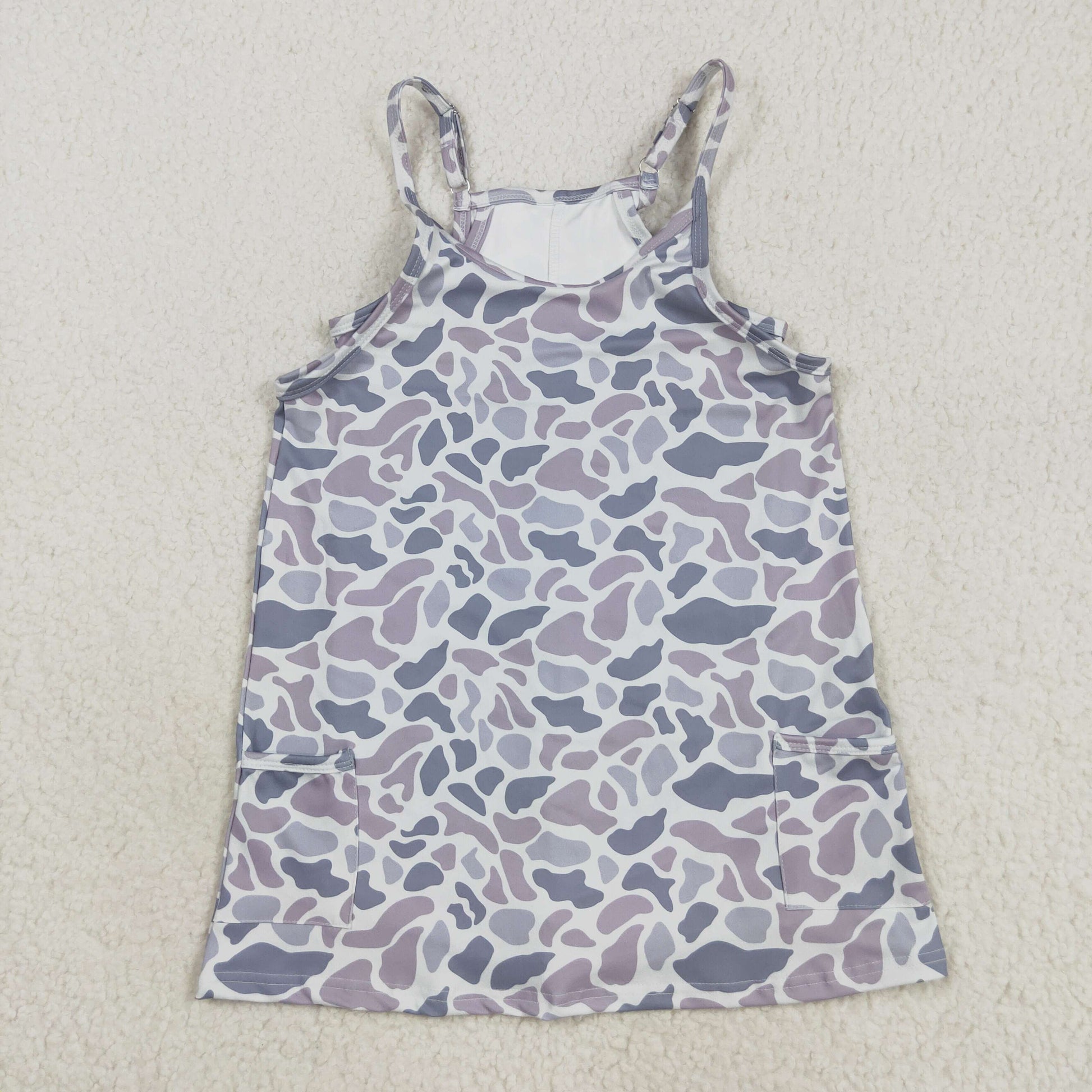 Grey Camo Print Strap Pockets Mom and Me Summer Knee Length Yoga Dress