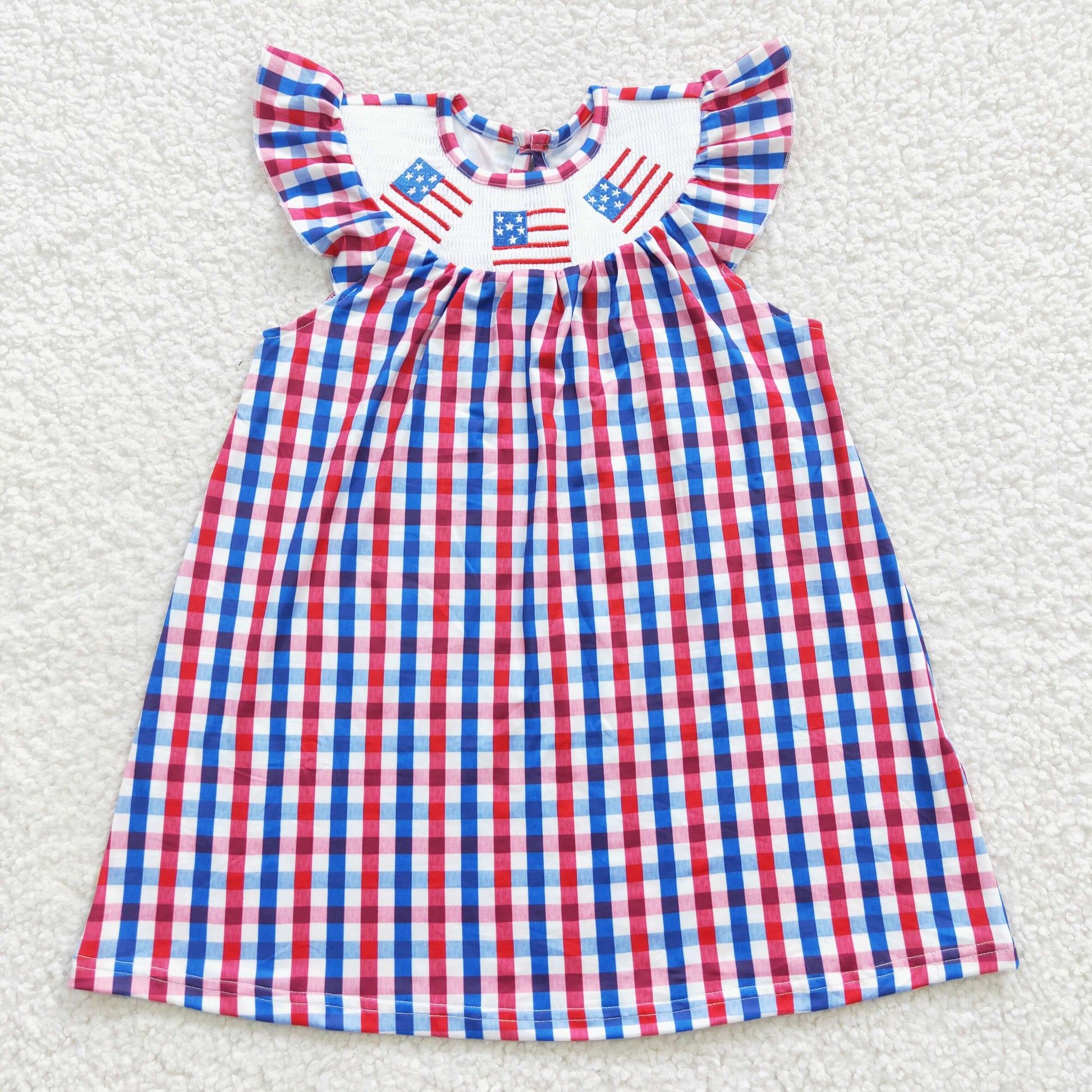 GSD0387 Smocked Gingham knee length flag embroidery girls 4th of July dress