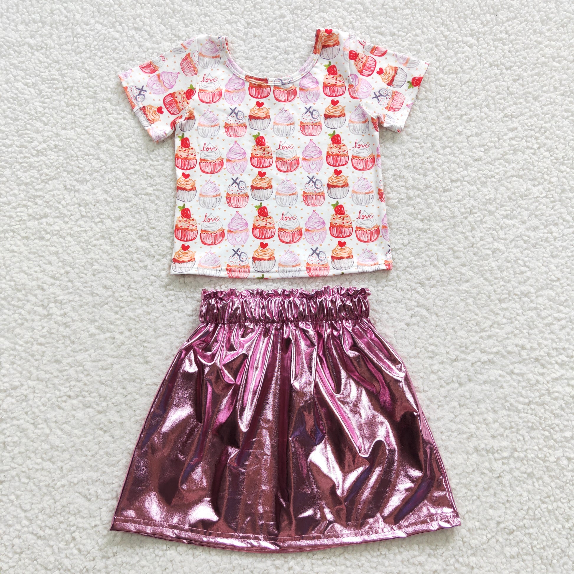 GSD0412 Girls pink cupcake top leather skirt Valentine's Day clothes set