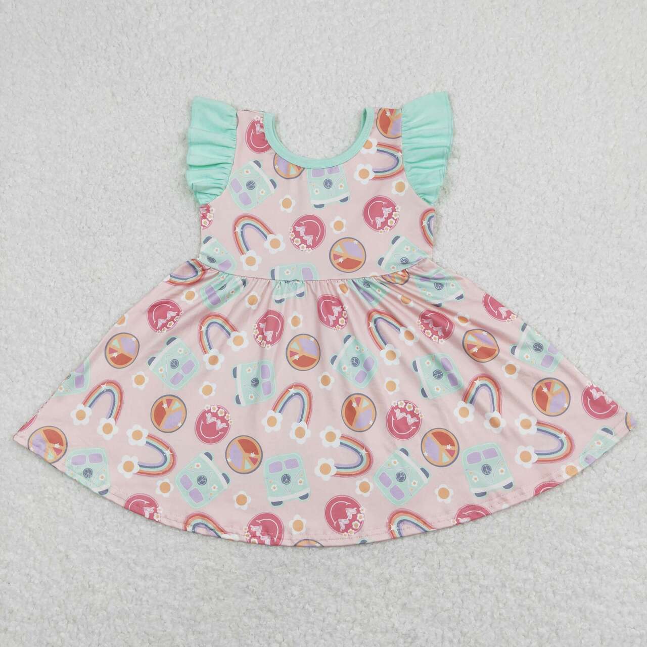 GSD0717 Rainbow Smiling Face Bus Print Girls Knee Length Summer Dress