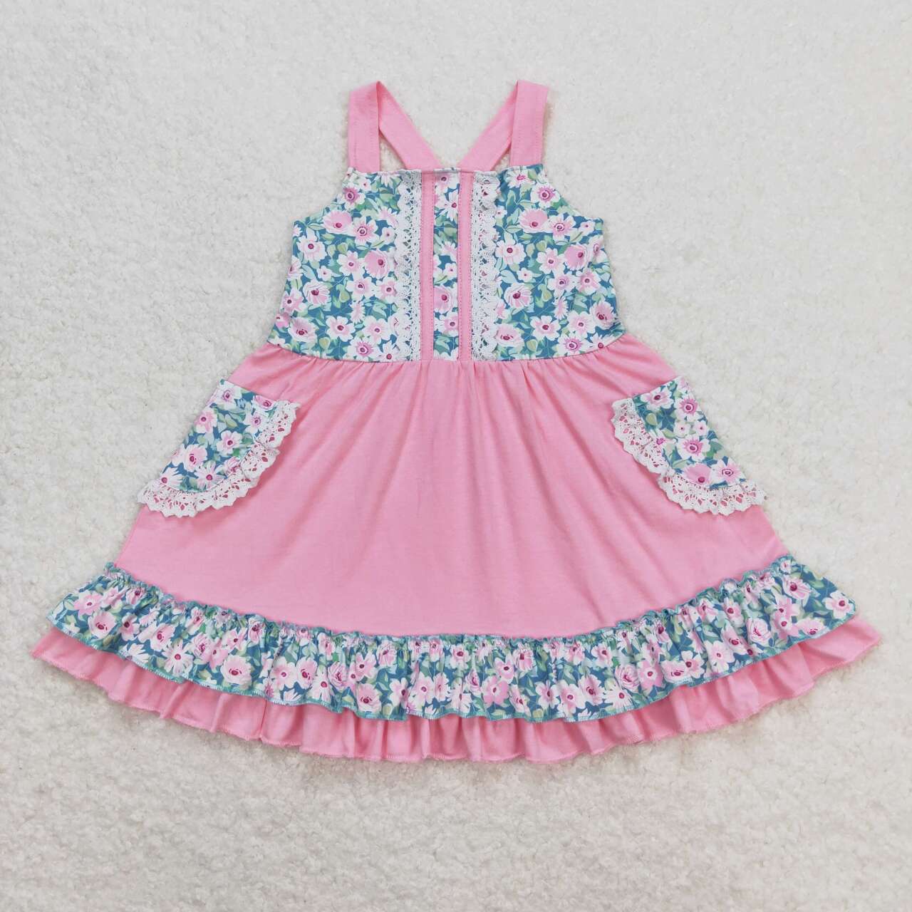 GSD0807 Pink Flowers Print Pockets Girls Summer Knee Length Dress